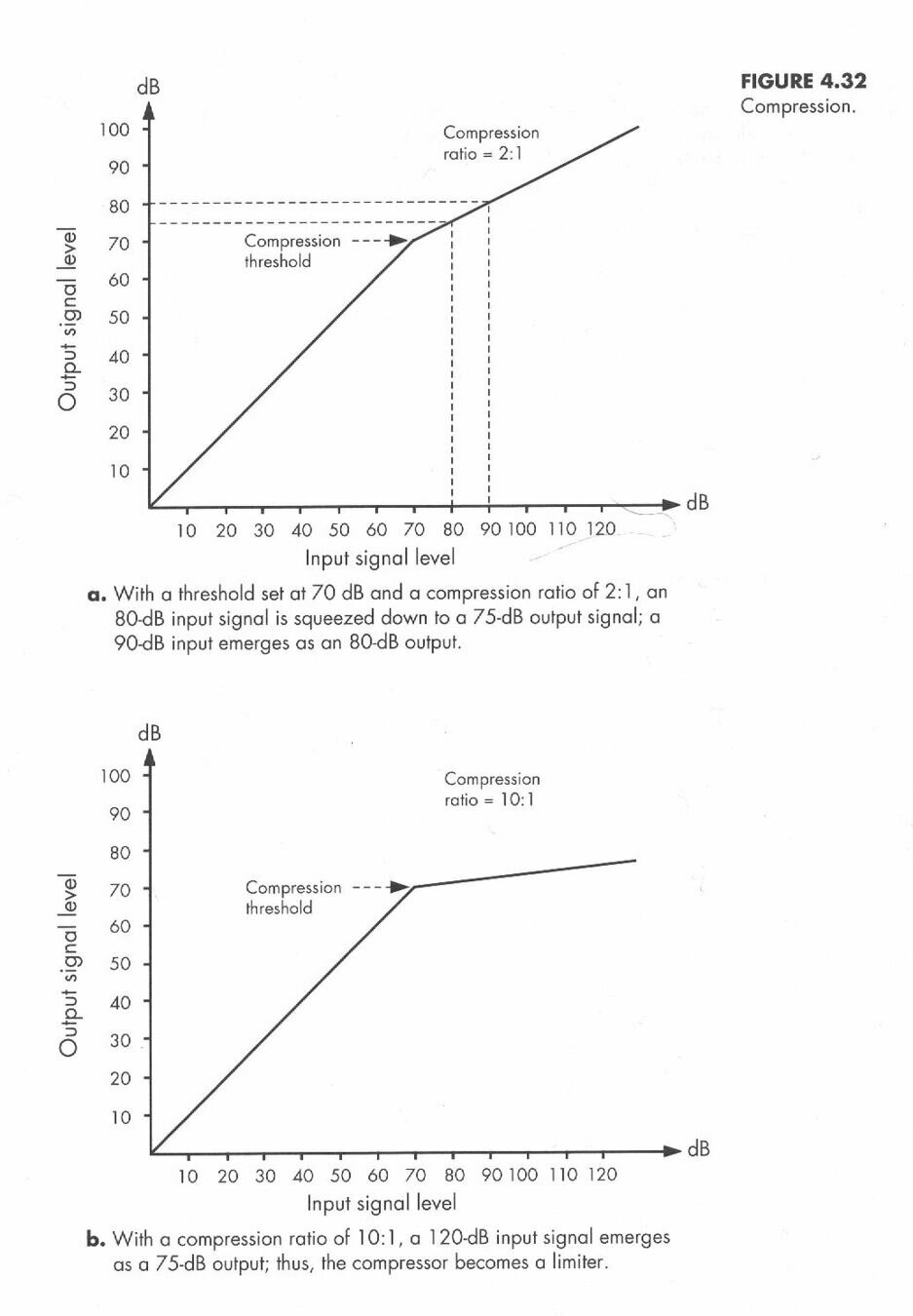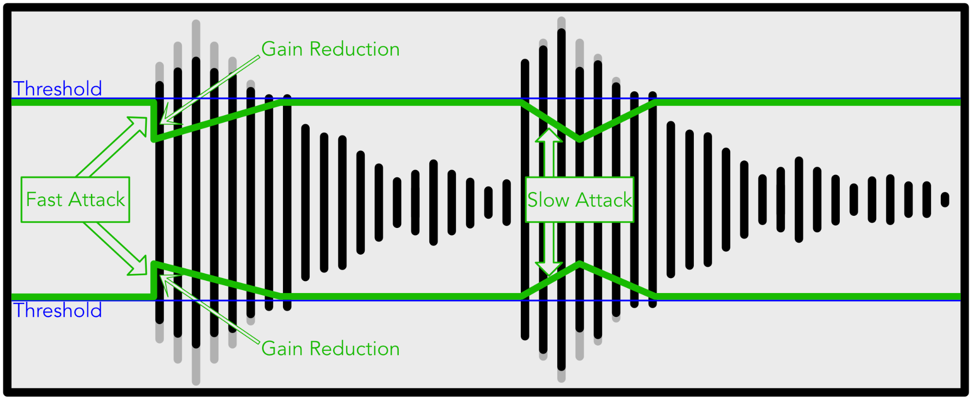 The compressor controls the dynamic range by reducing the gain of any signal that is above its threshold, by the amount of the ratio.