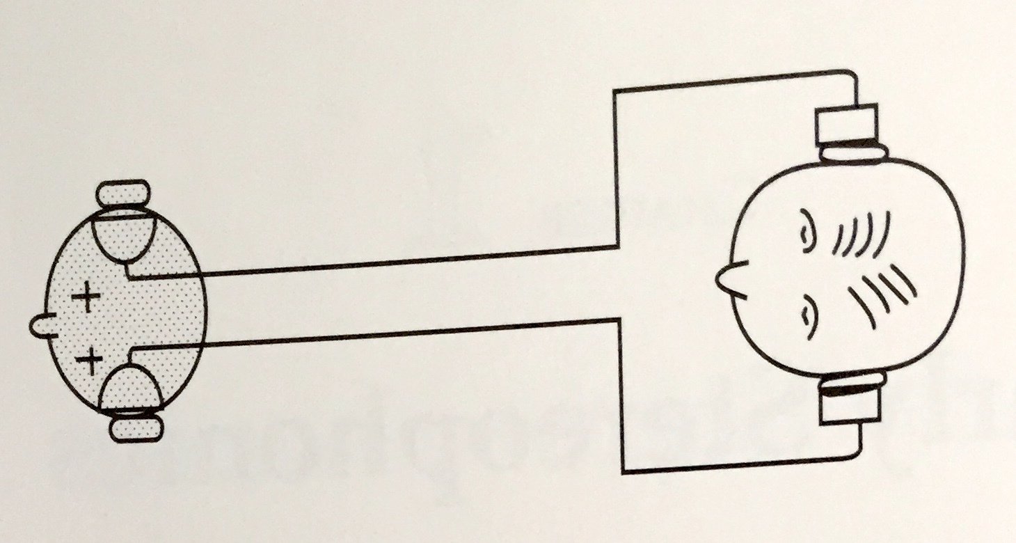 Sound arrives at about the same amplitude, but slightly different times at each mic.