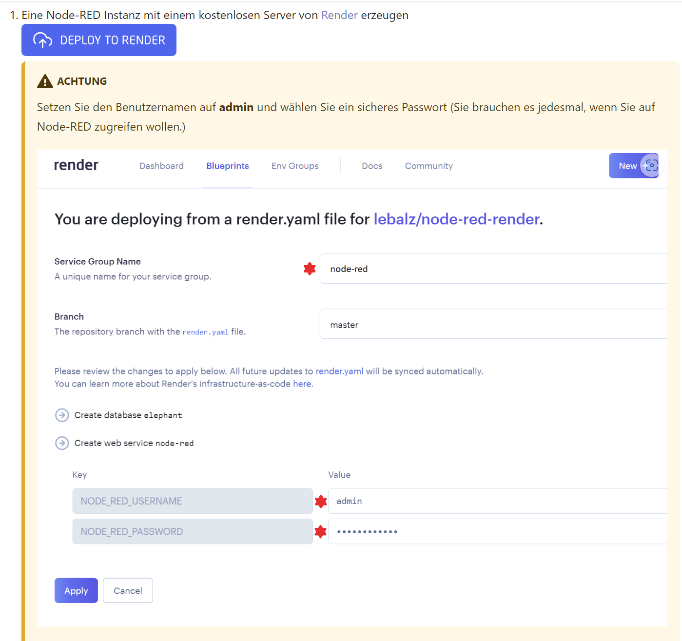 (2) Render bietet für 3 Monate eine kostenlose PG-Datenbank (danach wird sie gelöscht). Wer eine kostenlose Variante möchte: https://github.com/lebalz/node-red-render-no-db --> DB Connection String auf http://elephantsql.com konfigurieren
