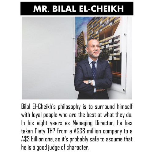 I think all successful people do things they love: Bilal El-Cheikh https://www.afr.com/property/developer-piety-investments-gets-100-million-from-gulf-fund-crestmount-capital-20170327-gv72ol Bilal El-Cheikh’s philosophy is to surround himself with loyal people who are the best at what they do. In his eight years as Managing Director, he has taken Piety THP from a A$38 million company to a A$3 billion one, so it’s probably safe to assume that he is a good judge of character.