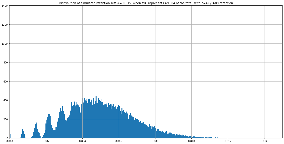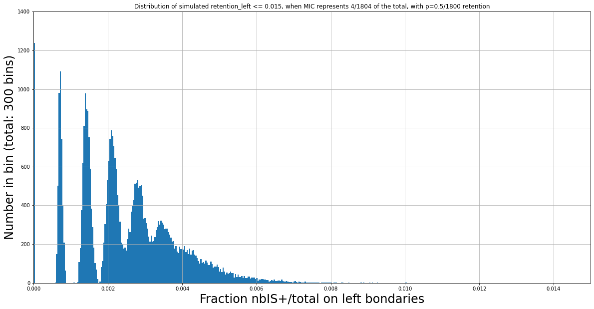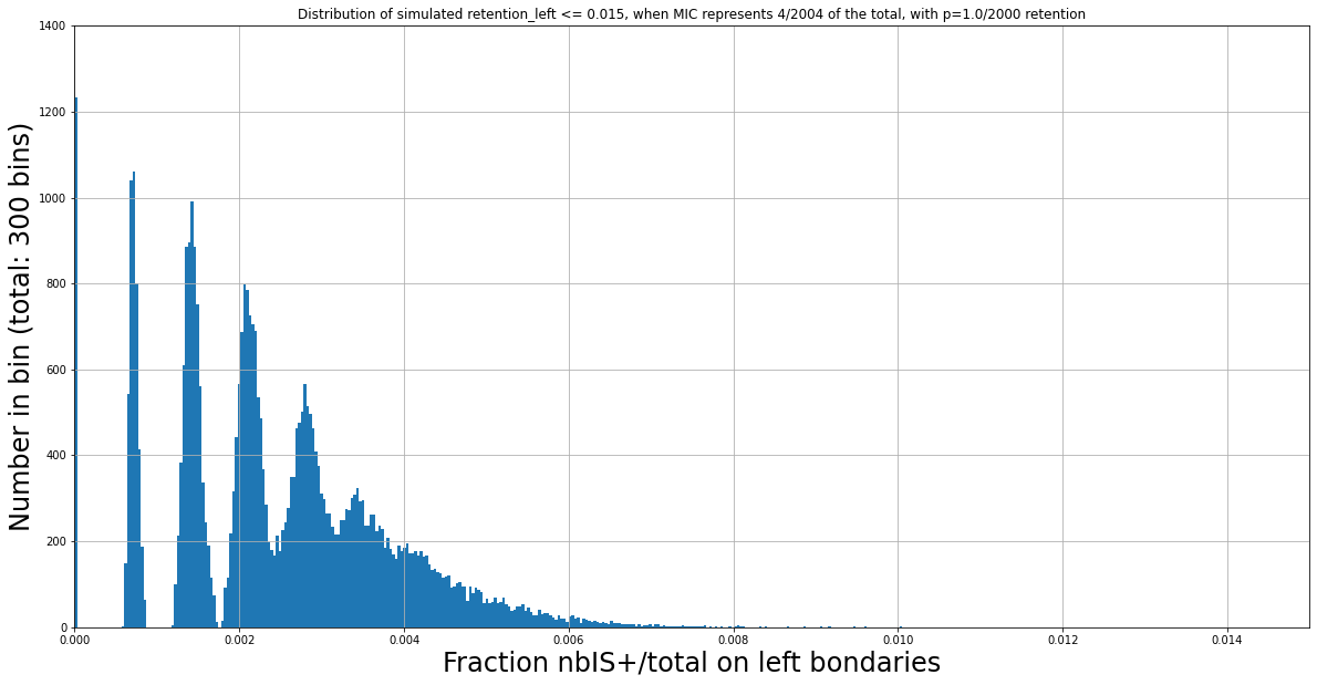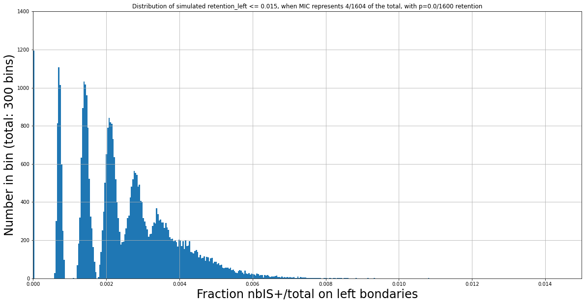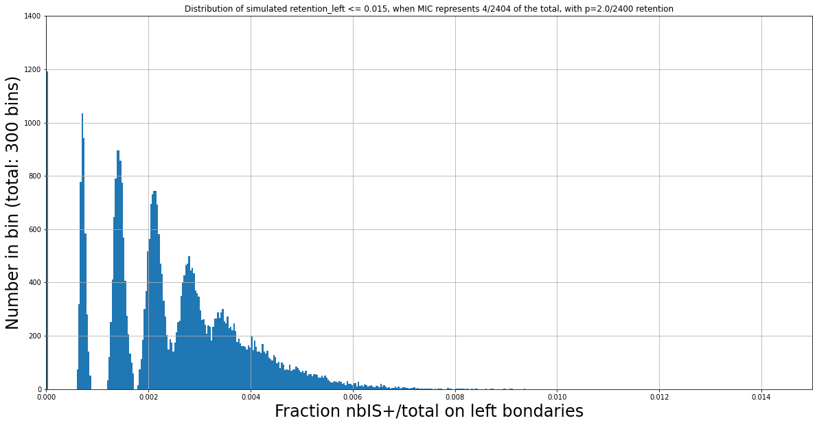 (Zoomed) Expected distribution of \(\frac{nbIES+}{total\ reads} \) with Monte Carlo simulation, when P(MIC) = 4/1604