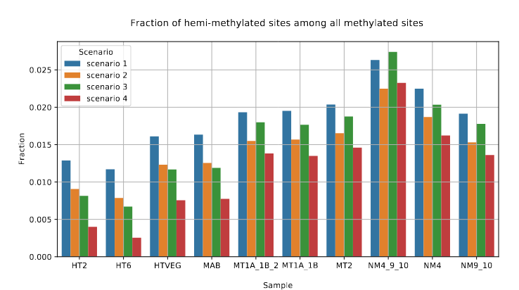 We can also find the number of hemi-methylated sites being detected as such, and the proportion of sites detected as hemi-methylated that are really hemi-methylated. This is possible because we now approximately know PZ0, PZ1 and PZ2, and P(D|Z) is easy to determine: