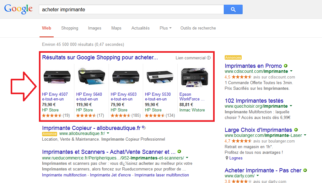 - Les comparateurs de Google apparaissent de manière bien plus apparente que les résultats de recherche qui suivent