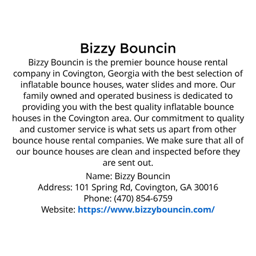 https://www.bizzybouncin.com/ Bizzy Bouncin is the premier bounce house rental company in Covington, Georgia with the best selection of inflatable bounce houses, water slides and more.