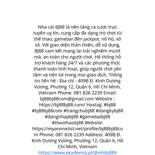Website: https://myanimelist.net/profile/bj88bj88com Nha cái BJ88 là nền tảng ca cược trực tuyến uy tín, cung cấp đa dạng trò chơi từ thể thao, gamebai đến jackpot, nô hũ, xô số. Với giao diện thân thiện, dễ sử dụng, BJ88 cam kết mang lại trải nghiệm