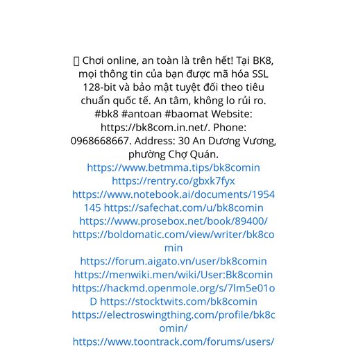 Website: https://bk8com.in.net/. 🛡️ Chơi online, an toàn là trên hết! Tại BK8, mọi thông tin của bạn được mã hóa SSL 128-bit và bảo mật tuyệt đối theo tiêu chuẩn quốc tế. An tâm, không lo rủi ro. #bk8 #antoan #baomat Phone: 0968668667. Address: 3