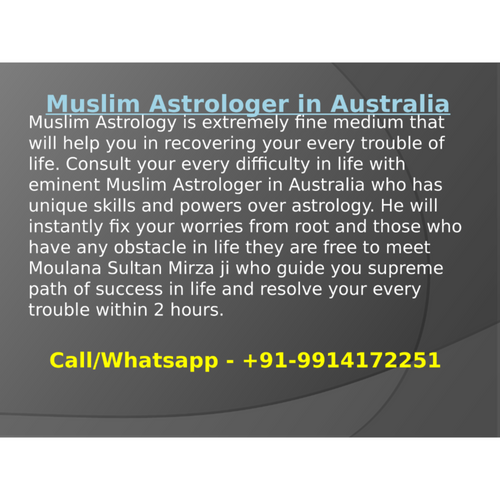 Contact most famous Muslim Astrologer in Australia who is well expert in astrological solutions for every type of worry. Contact Moulana Ji who fix your all difficulties in life within 2 hours any query call or Whatsapp now at +91-9914172251