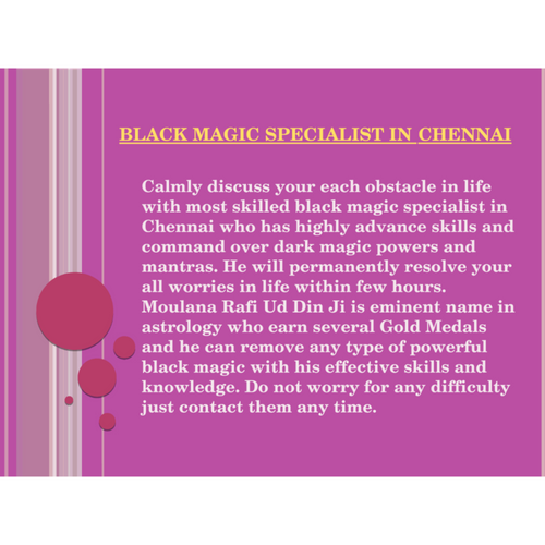 Black magic is supreme way to easily resolve your all issues of life. Meet talented black magic specialist in Chennai who has fine powers to quickly fix your all stress within 2 hours. If you have any query then call or whatsapp now at 91-9914172251 visit-http://www.blackmagicislam.com/black-magic-specialist-chennai.html