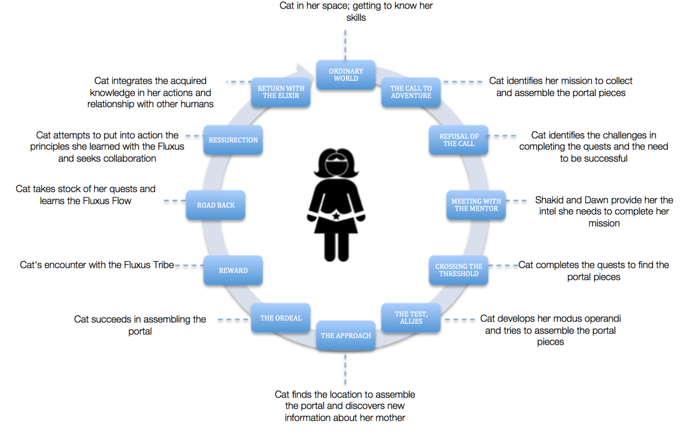 Cat, an ordinary teen girl, living in Portugal, is a seeker of the Fluxus tribe (native cyberspace warriors) with the mission to assemble a portal that ultimately allows the Fluxus to interact with humans. The portal pieces are scattered all over the world. In order to collect them, Cat relies on her cat, an undercover warrior of the Fluxus, to give her clues. Together they will try to connect the Fluxus to mankind.