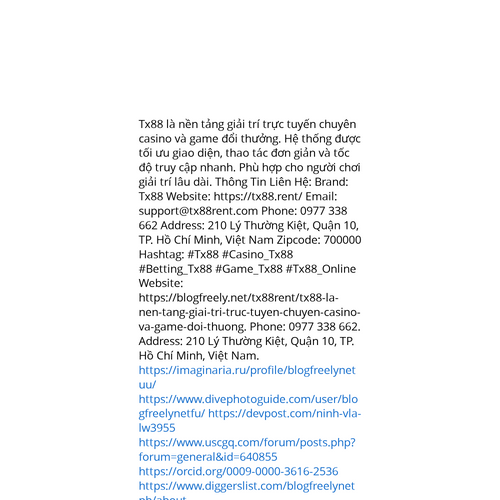Website: https://blogfreely.net/tx88rent/tx88-la-nen-tang-giai-tri-truc-tuyen-chuyen-casino-va-game-doi-thuong. Tx88 là nền tảng giải trí trực tuyến chuyên casino và game đổi thưởng. Hệ thống được tối ưu giao diện, thao tác đơn giản và tốc độ truy cậ