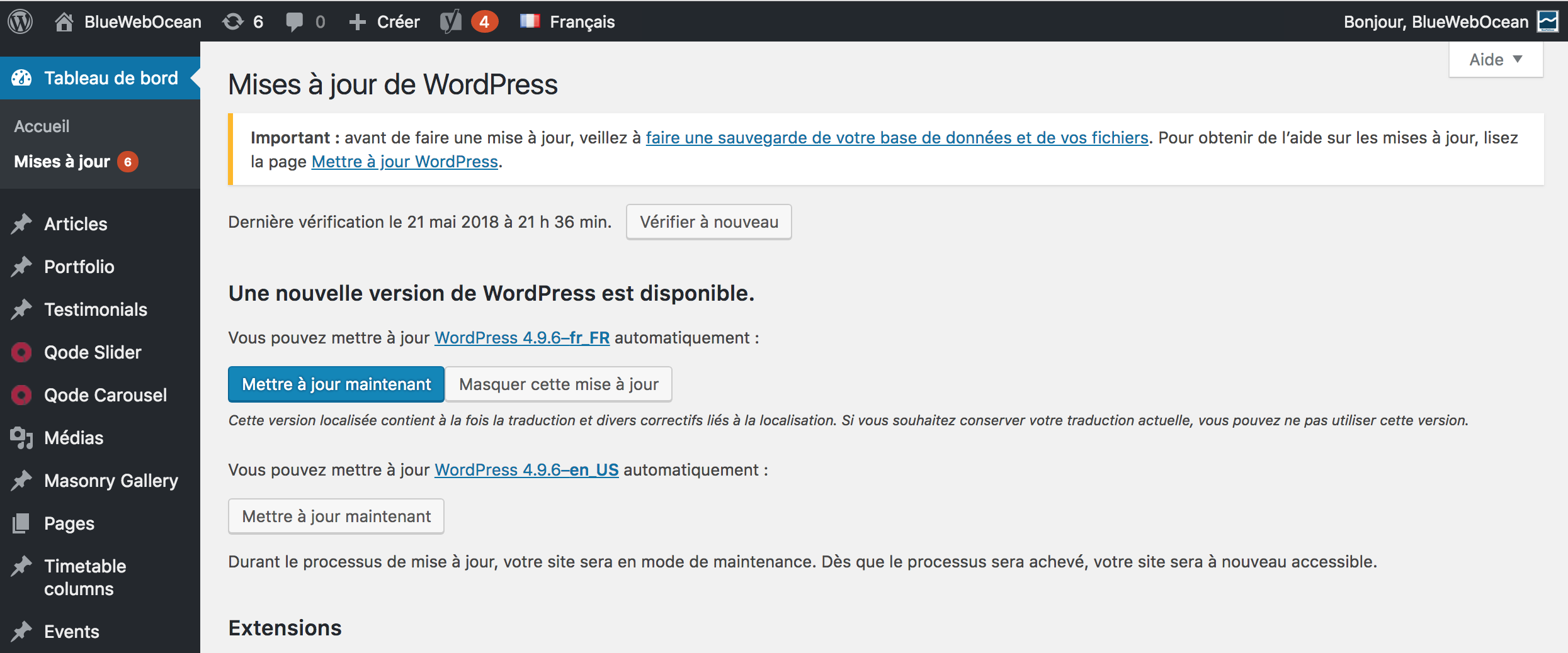 Vous atterrissez sur la page des Mises à jour du Core de WordPress et de ses extensions