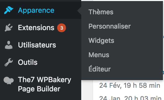 Apparence = dans Apparence se trouvent les rubriques Thèmes, Widgets, Menus et Editeur.
