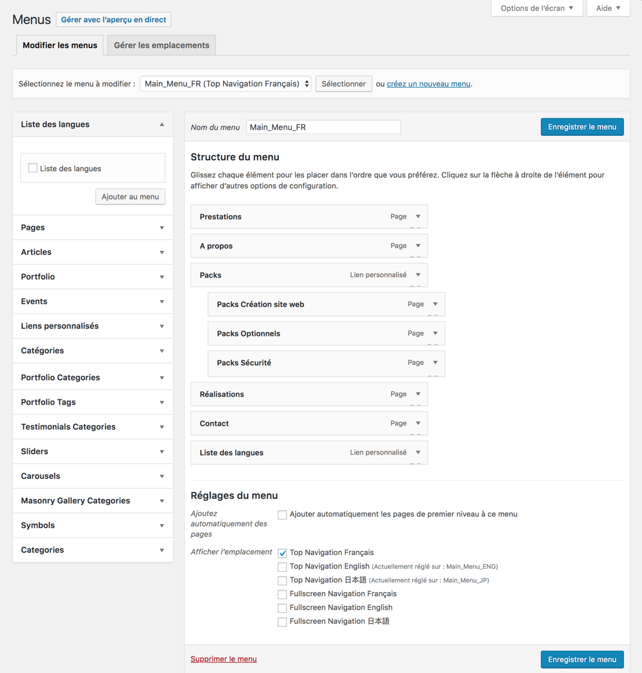 Menus = permet de créer un menu personnaliser en le nommant puis d'y insérer les pages créées que vous souhaitez faire apparaître dans la barre de navigation.