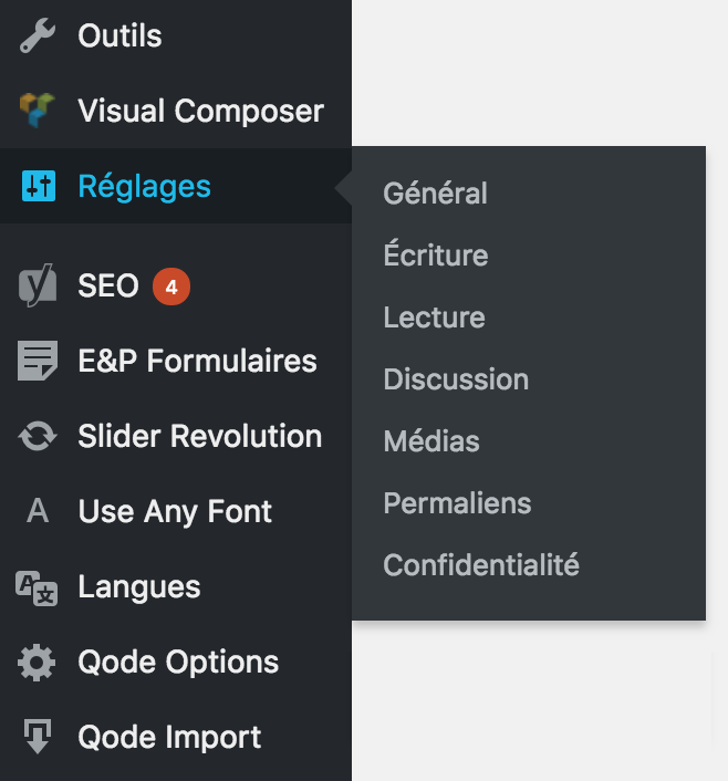 Réglages = permet de configurer les informations de son site web en fonction du réglage Général , de l'Ecriture, de la Lecture, de la Discussion, des Médias, des Permaliens et de la Confidentialité.