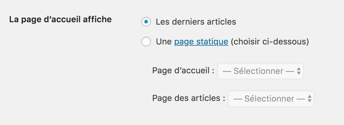 Lecture = permet de configurer sa page de blog et sa page d'accueil. Par défaut le blog (les derniers articles) s'affichera sur la page d'accueil, le nombre d'articles à afficher, gérer le flux RSS et choisir d'être visible ou pas sur les moteurs de recherche.