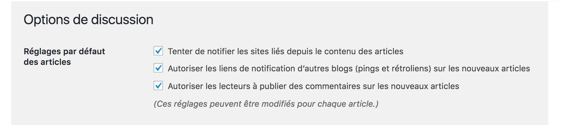 Discussion = permet gérer les commentaires postés par les visiteurs du site et les pings qui sont des notifications de liens. Vous pouvez choisir de laisser les commentaires libres ou de laisser le visiteur s'enregistrer pour pouvoir commentaire. De plus vous pouvez être avertit par message dès qu'un nouveau commentaire est posté, vous pourrez les modérer et aussi "blacklister" certains visiteurs. Enfin vous pouvez régler l'affichage des avatars par défaut.