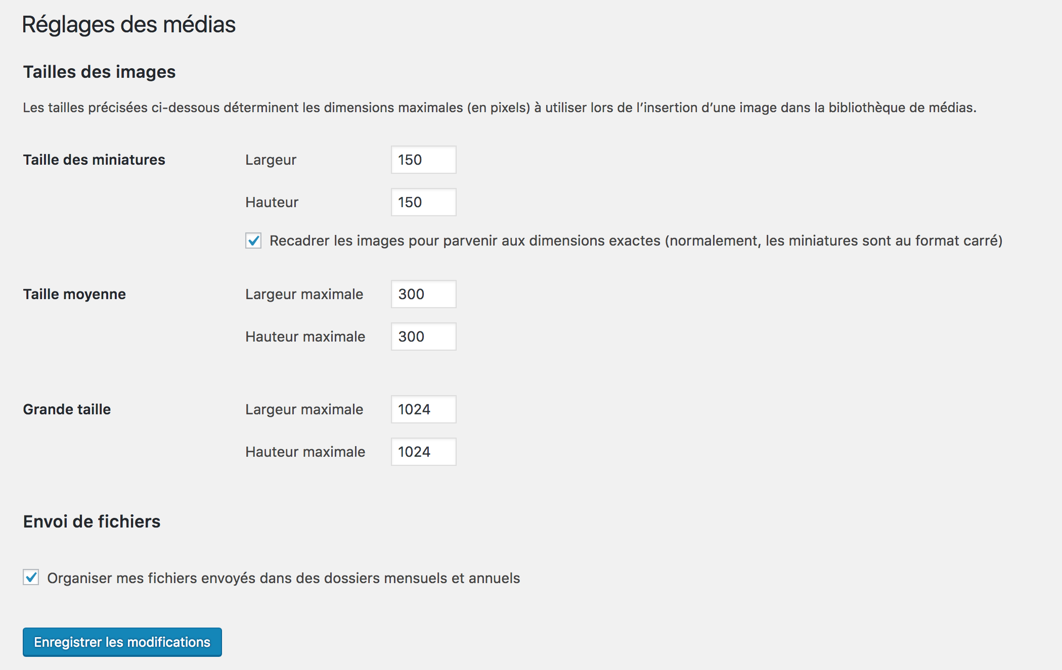 Médias = Permet de paramétrer la taille des images : pour les miniatures, la taille moyenne et les grandes taille. Ces formats s'adaptent pour les visuels de certains éléments par exemple un affichage d'articles. Toutefois vous êtes libre de télécharger l'image à la taille que vous souhaitez dans votre bibliothèque de Médias et l'utiliser avec sa taille originale.