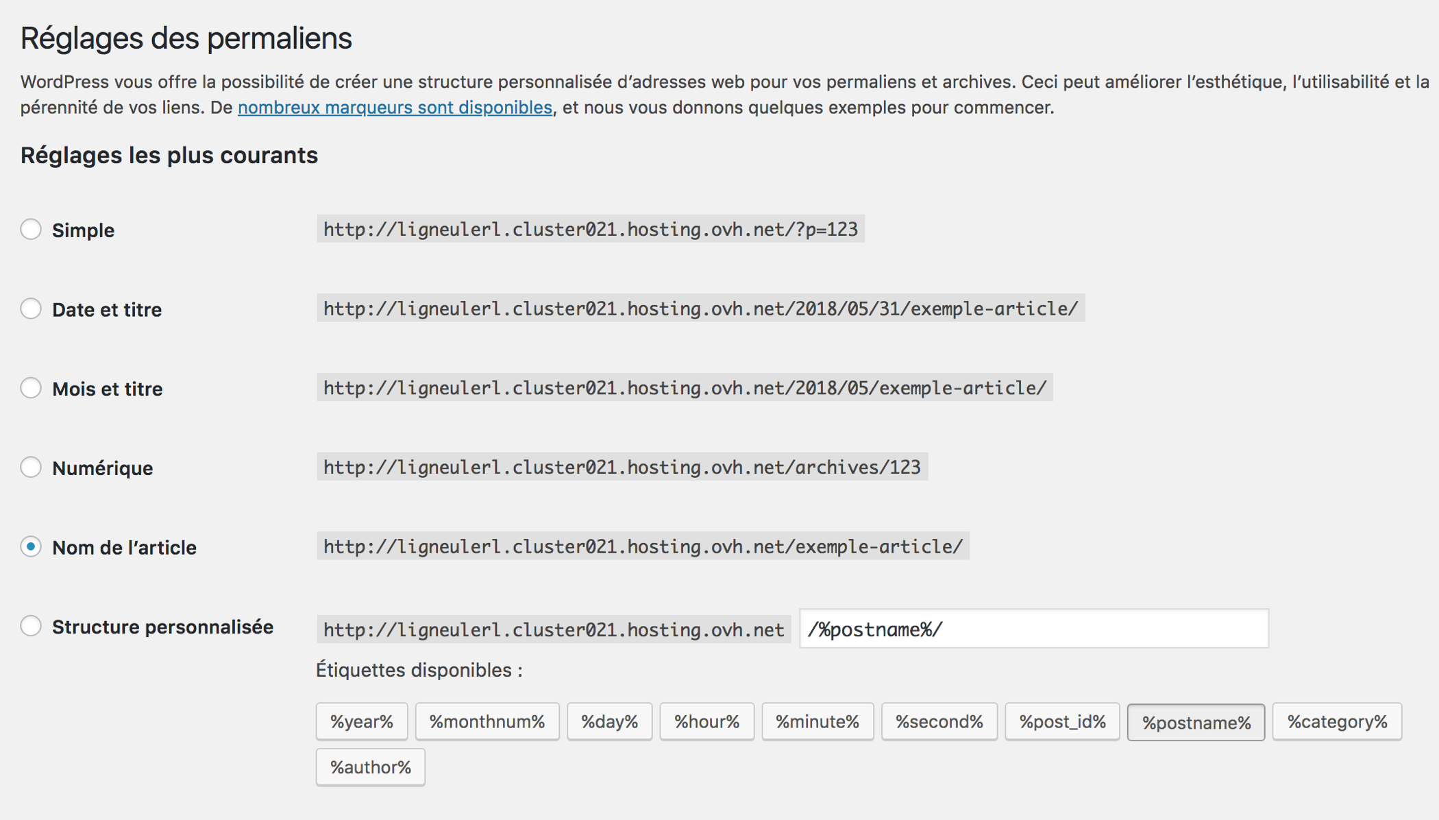 Permaliens = Permet de créer une structure personnalisée pour son URL. Vous pouvez sélectionner l'URL simple, avec date et titre, mois et titre, numérique, avec le nom de la page ou de l'article ou encore la personnalisée en y ajoutant les variables souhaitées.