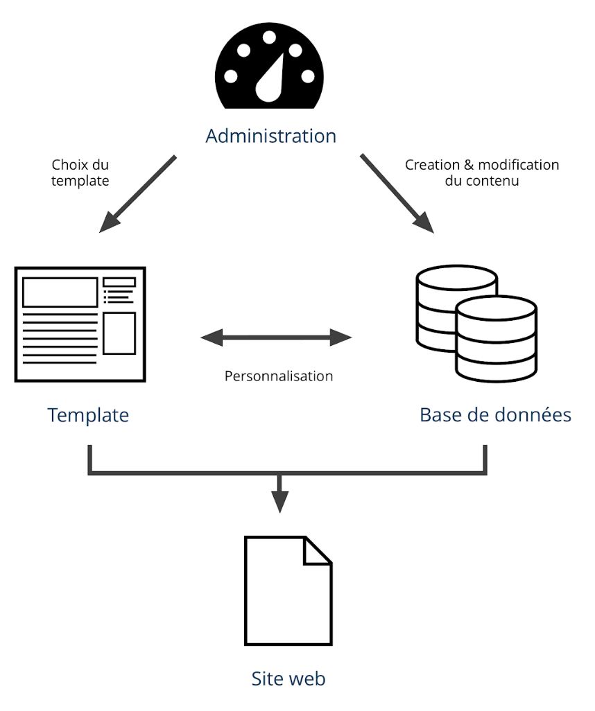 Les CMS permettent de travailler de façon distincte le contenu des pages : texte, médias, menus de navigation et la mise en forme générale, notamment avec l’utilisation d’un template (= thème).