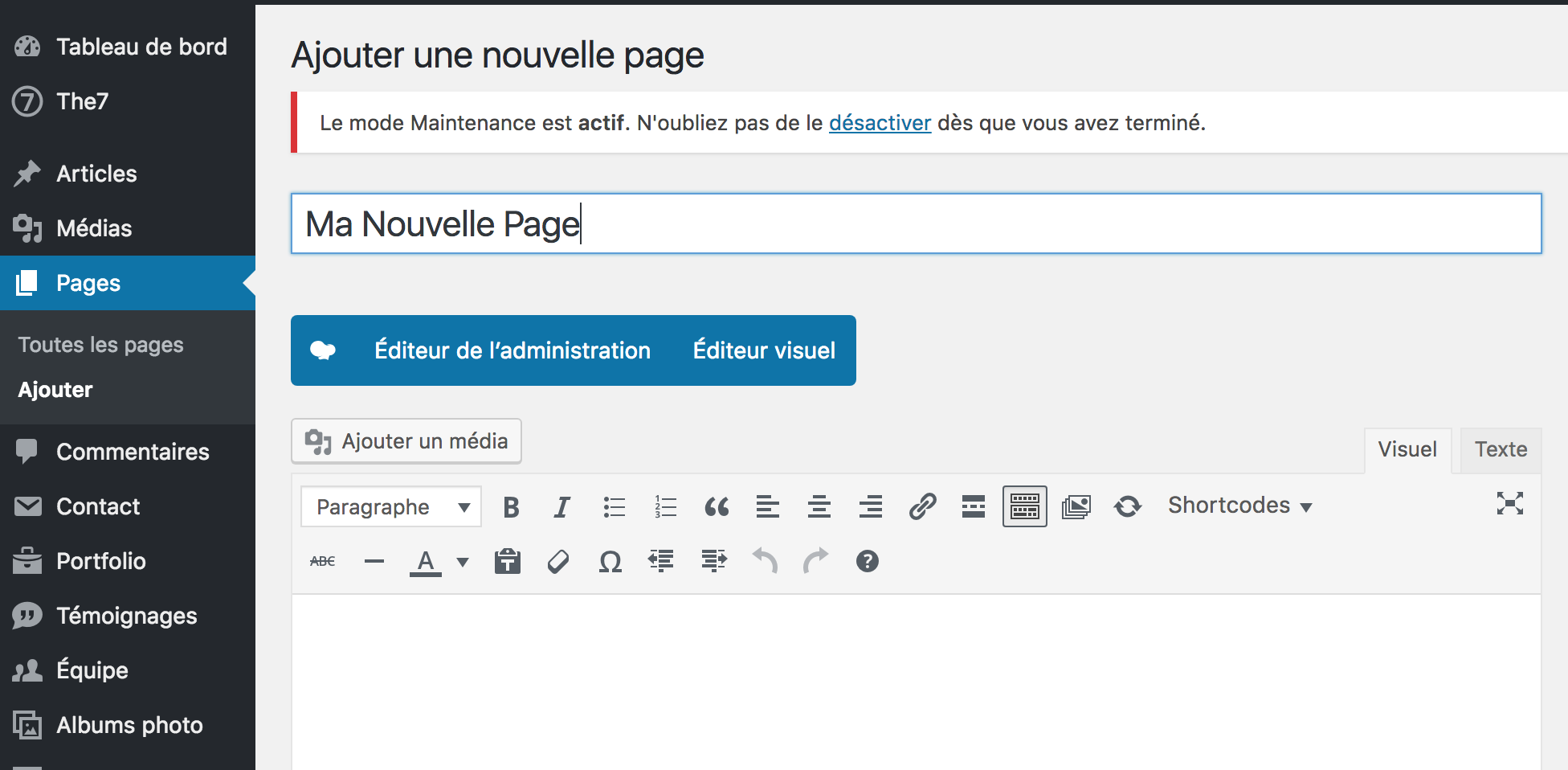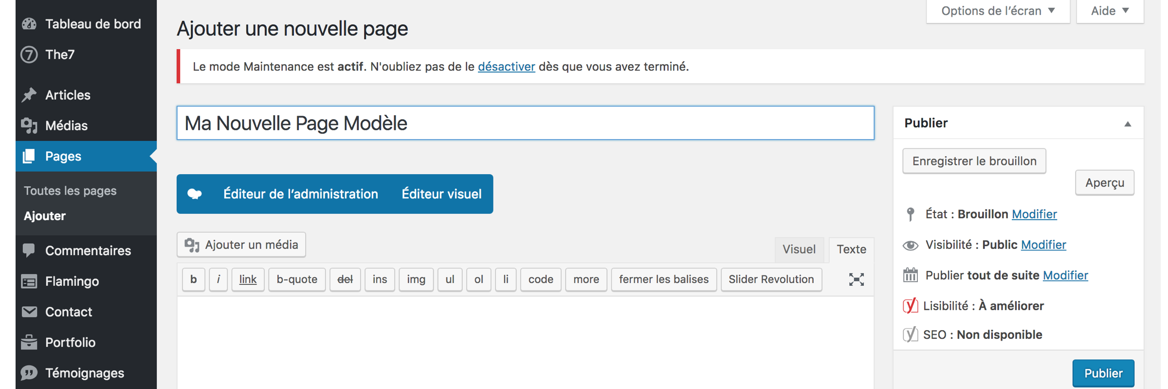 Puis installez le constructeur de page en pressant le bouton bleu "Editeur de l'administration".