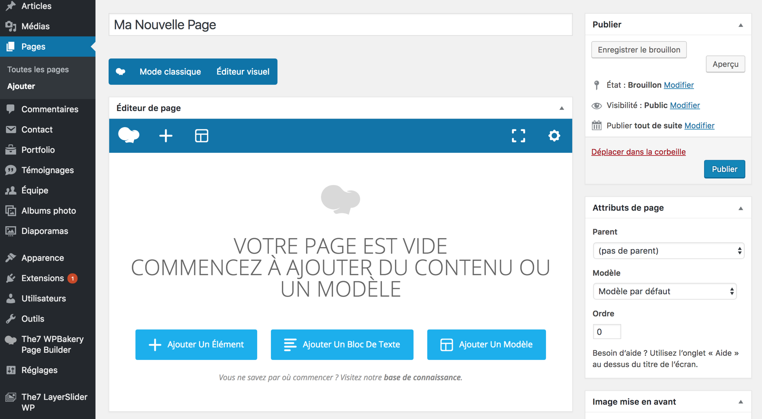 La page se transforme instantanément et est en état pour commencer la construction de la page avec WPBakery.