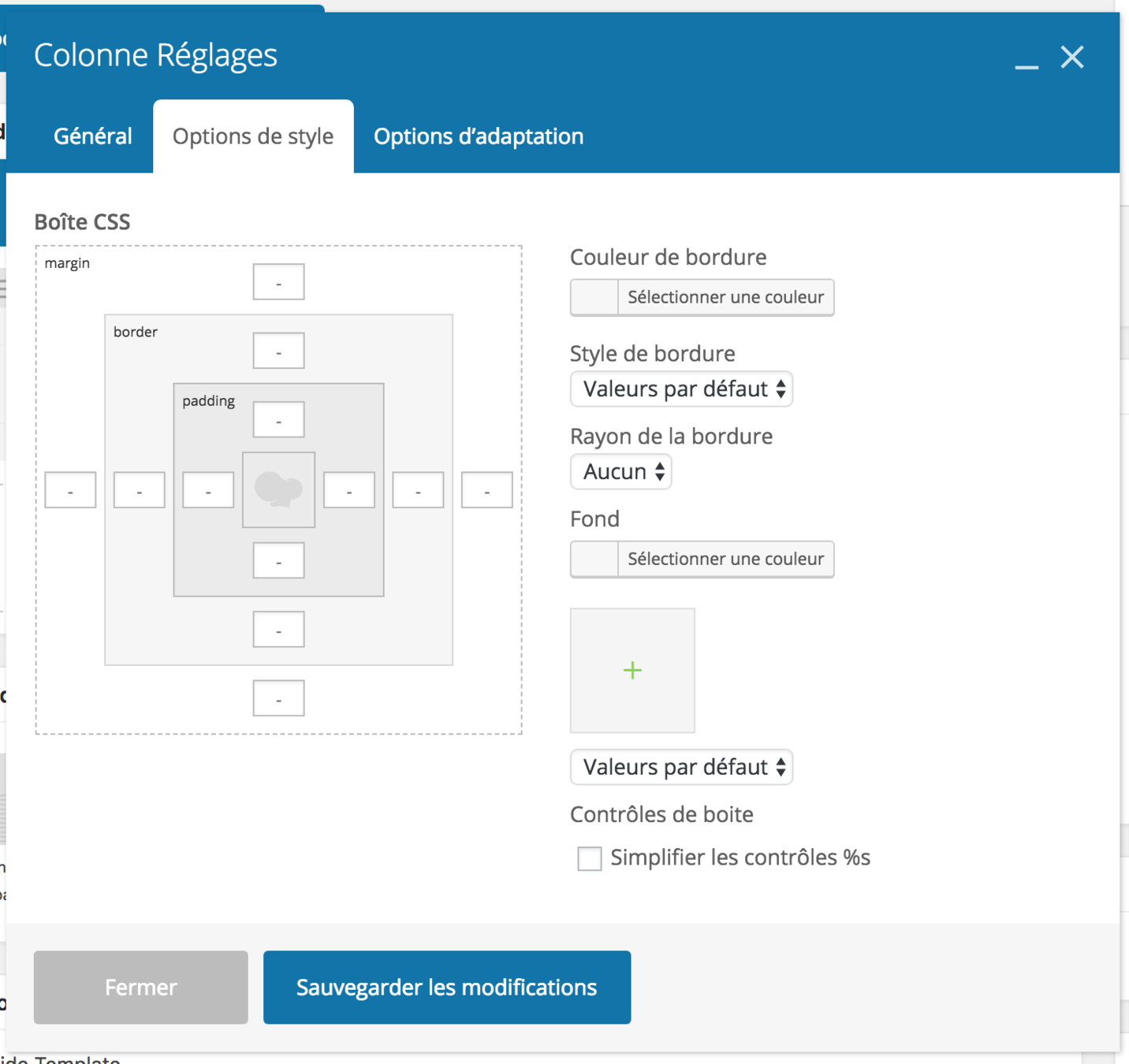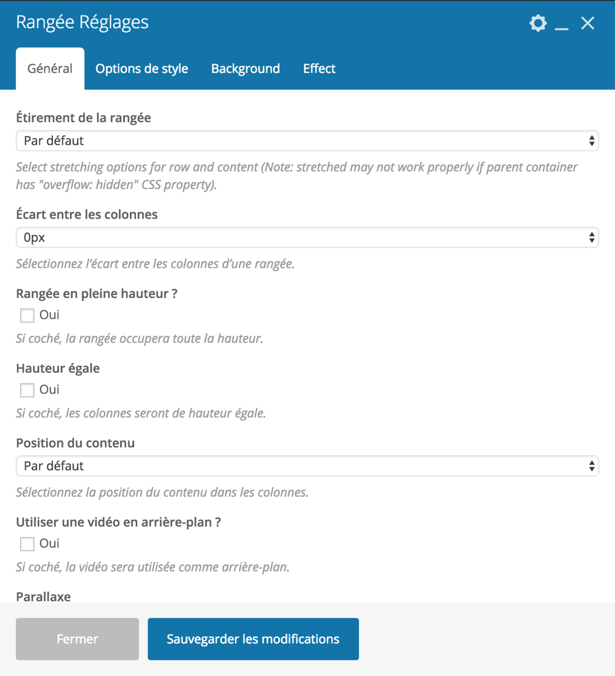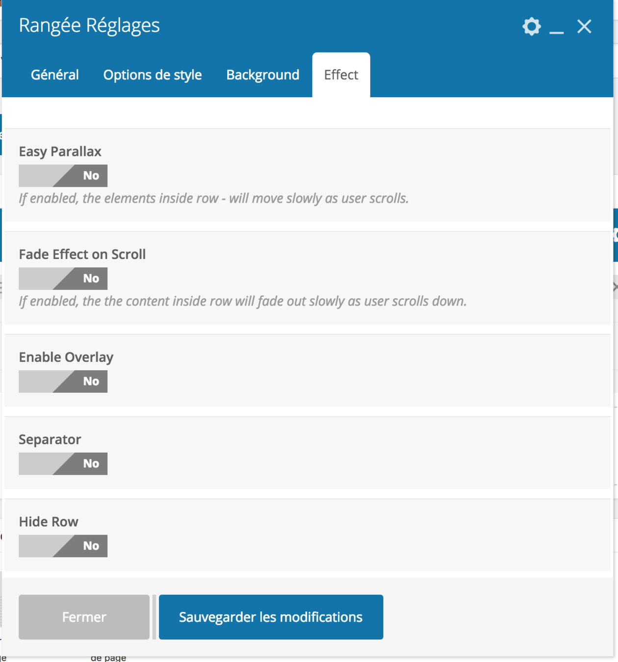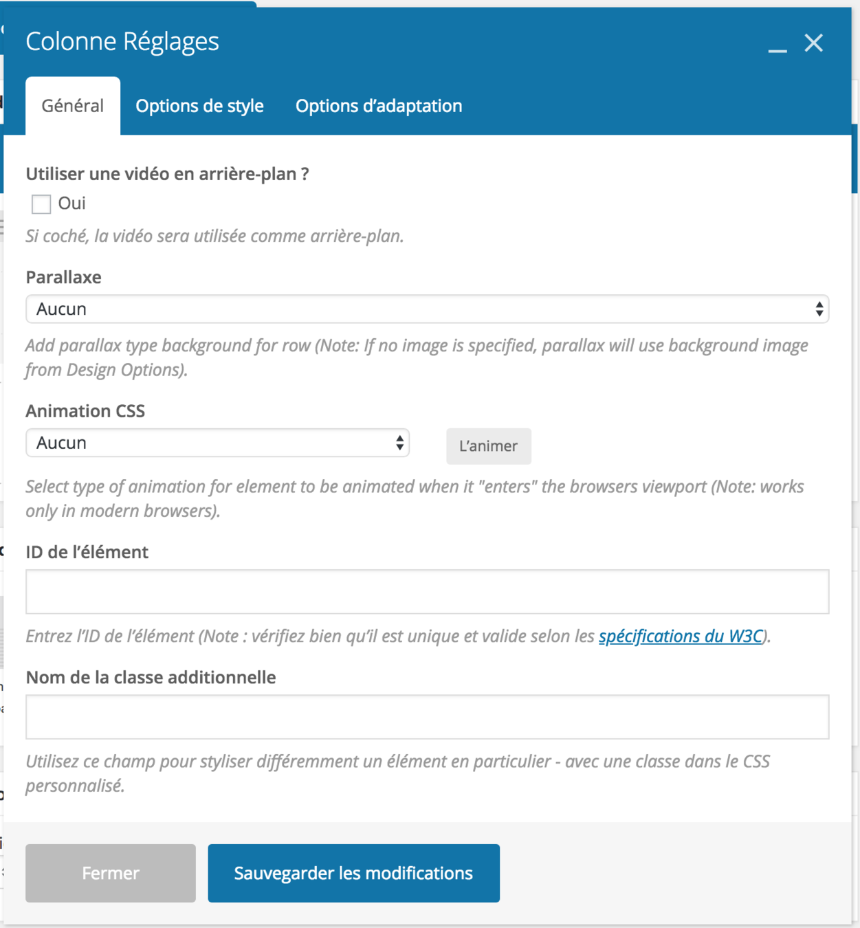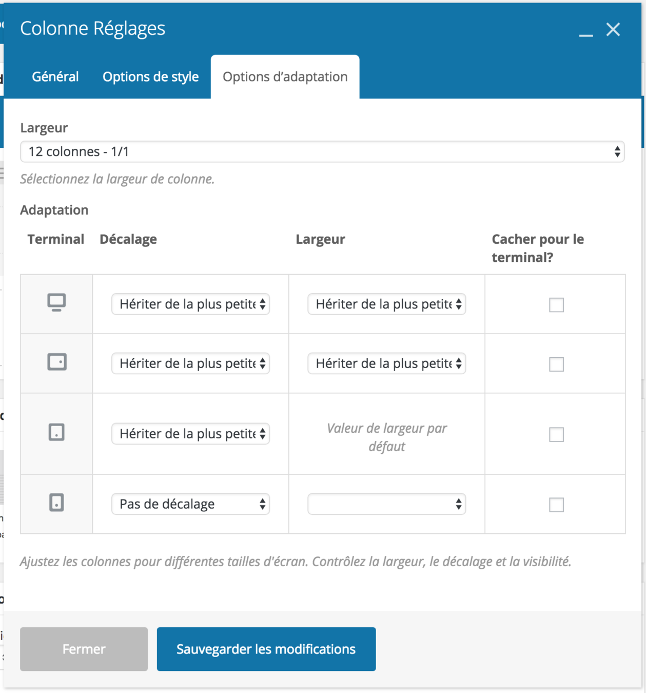 3 - Option d'adaptation : permet de faire apparaître ou pas le contenu de la rangée sur les supports (écrans ordinateur, tablettes ou mobiles)
