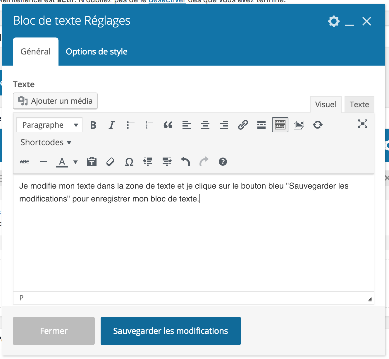 4 - A nouveau une fenêtre s'ouvre et fais apparaître le Réglages de l'élément Bloc de texte.