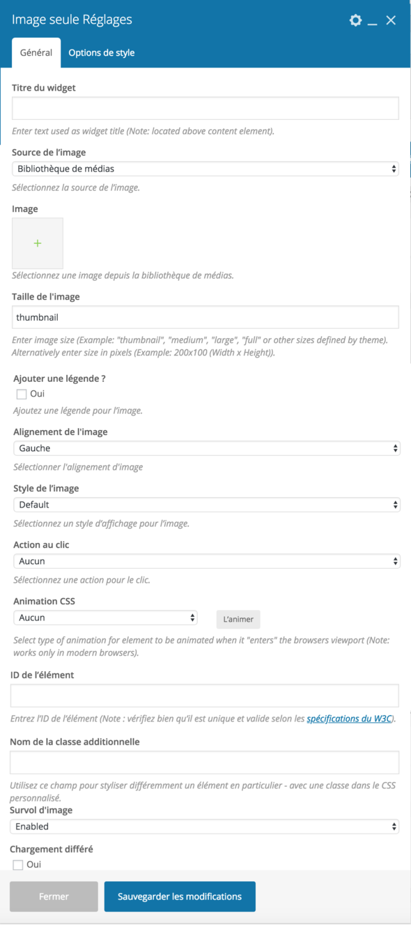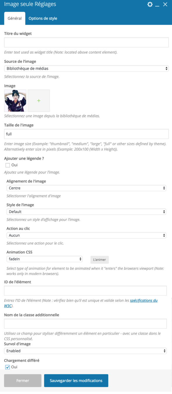 3- A nouveau une lightbox s'ouvre pour procéder aux Réglages de l'élément Image Seule.