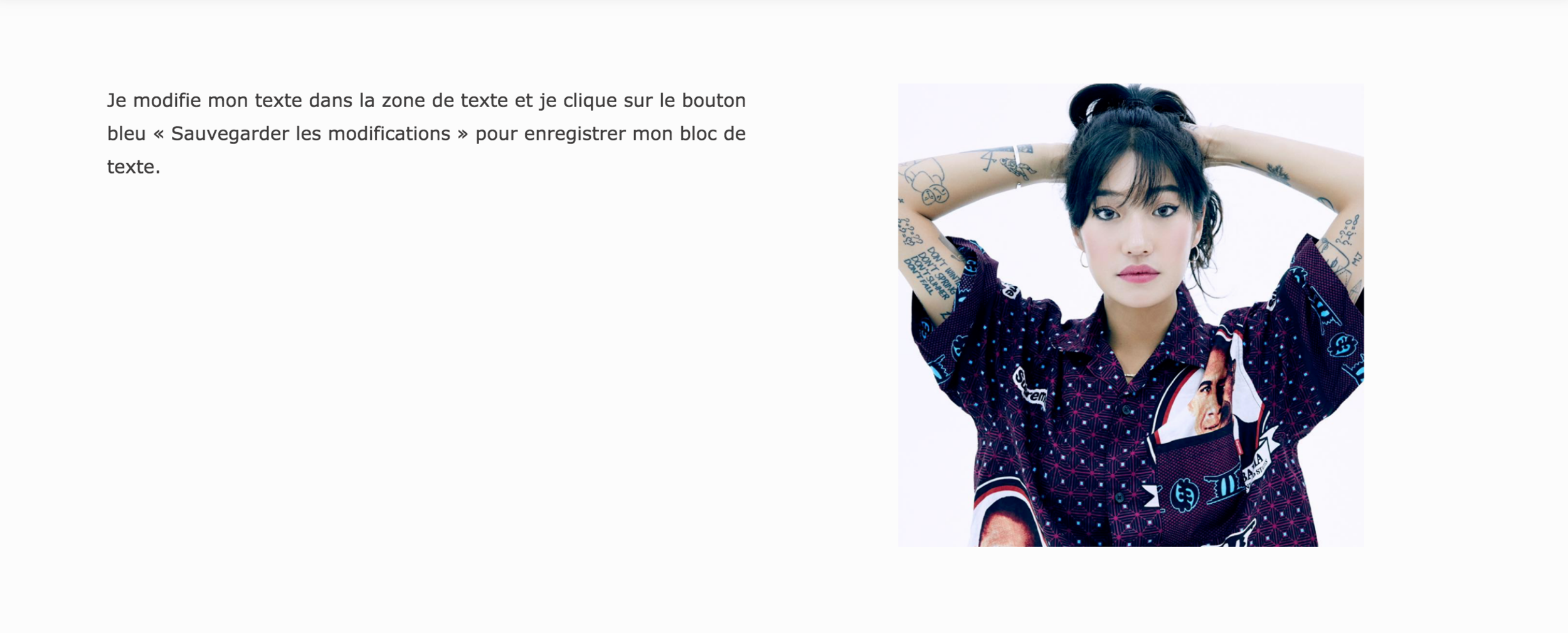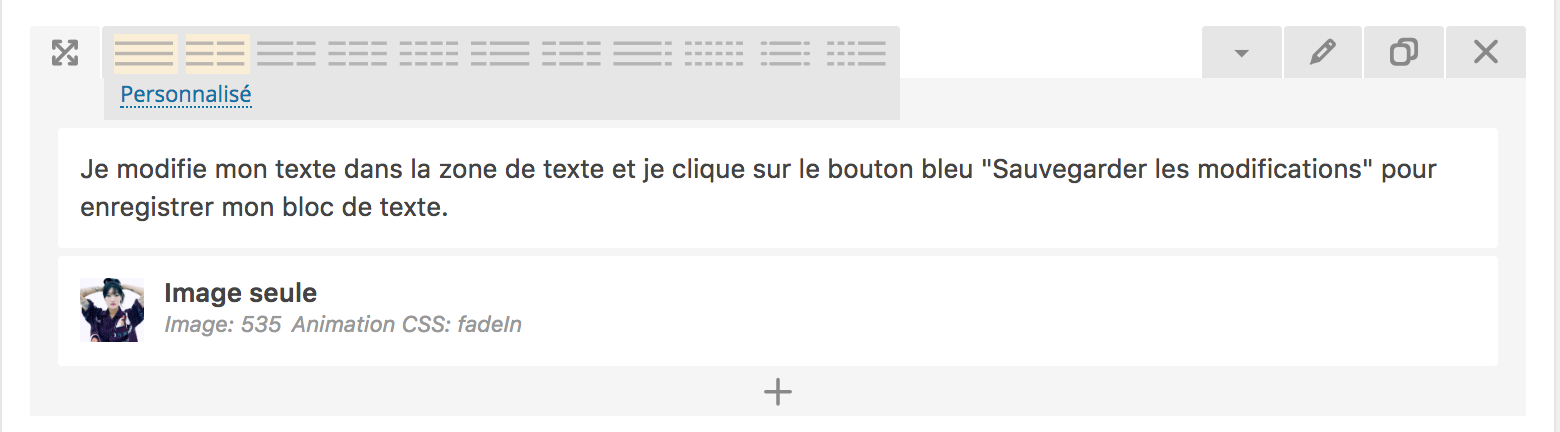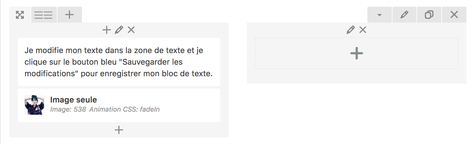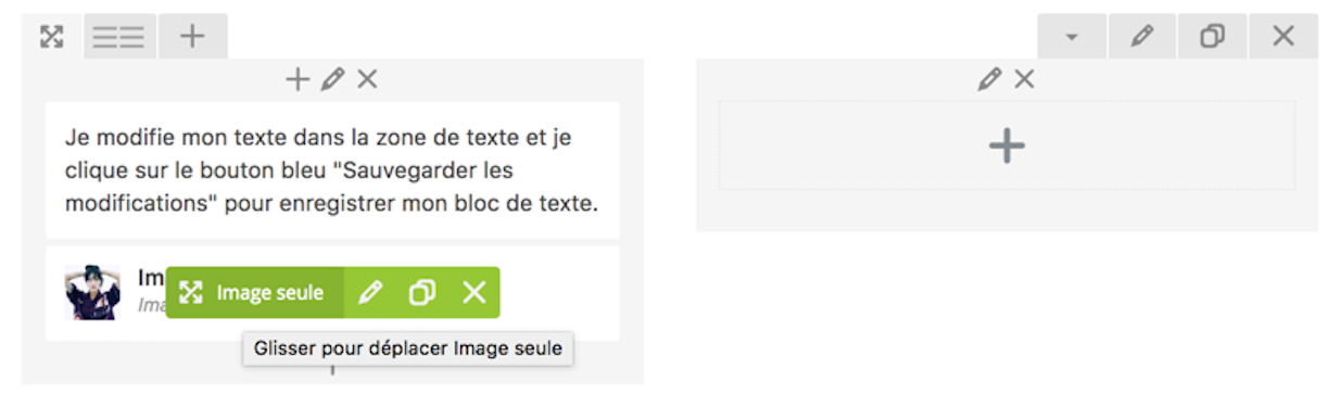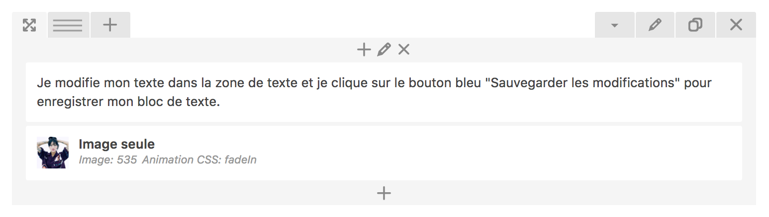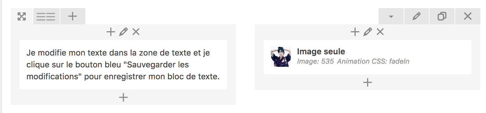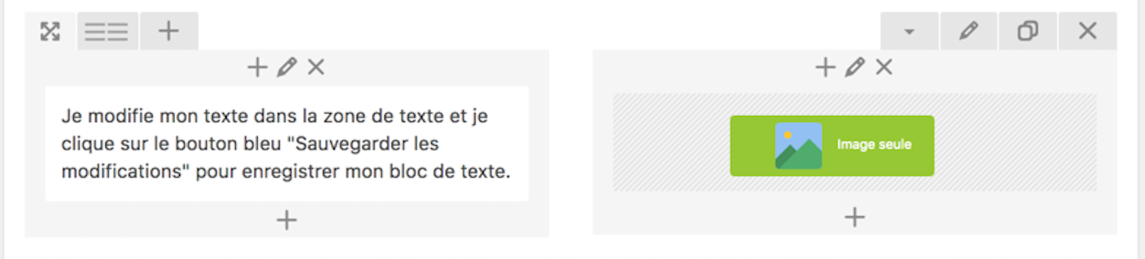 Nous voyons bien l'élément Bloc de texte et l'élément Image seule qui se suivent