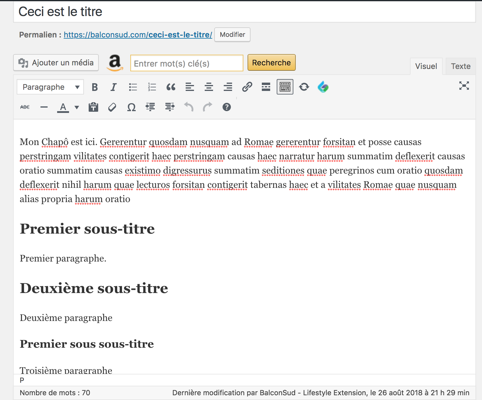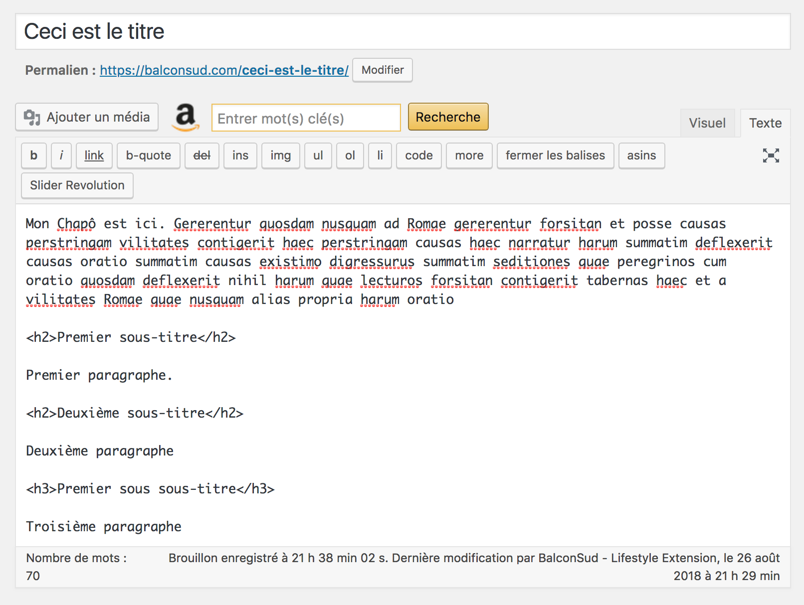 Le chapô est contenu dans les balises <h2>...</h2> en mode Texte ou Titre 2 en mode Visuel sur WordPress.