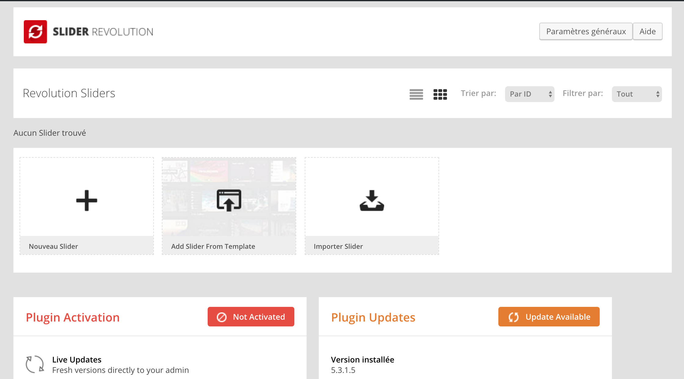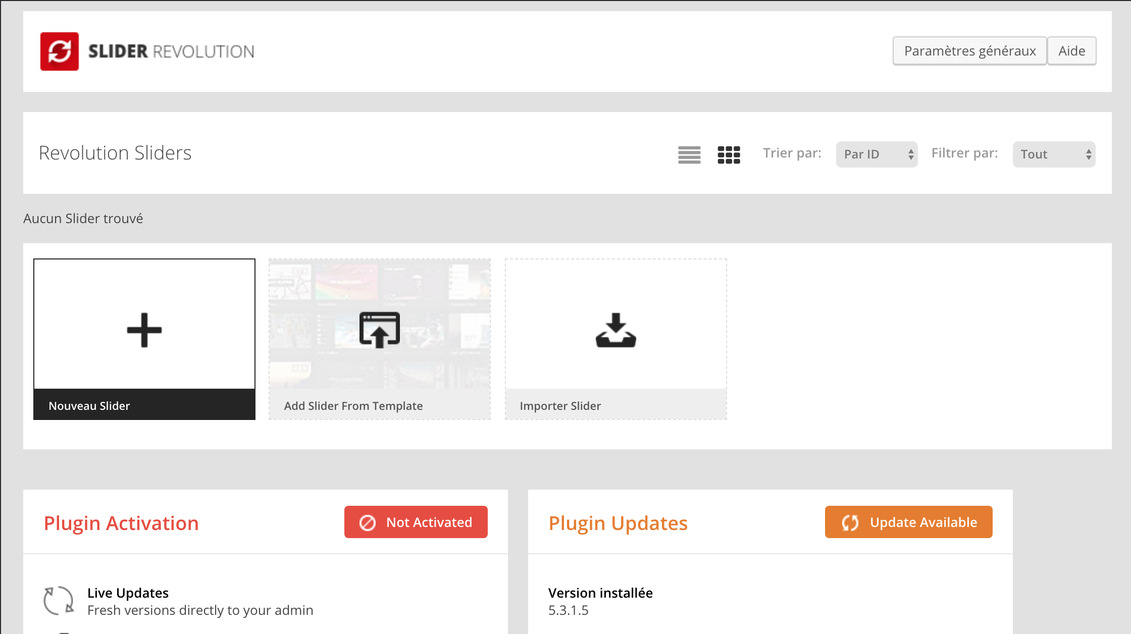 Slider Revolution : Lien renvoyant sur la page générale et Index du plugin pour créer ou éditer un slider. Plus vous pourrez avoir en un coup d'oeil les informations du plugin (version utilisée...)