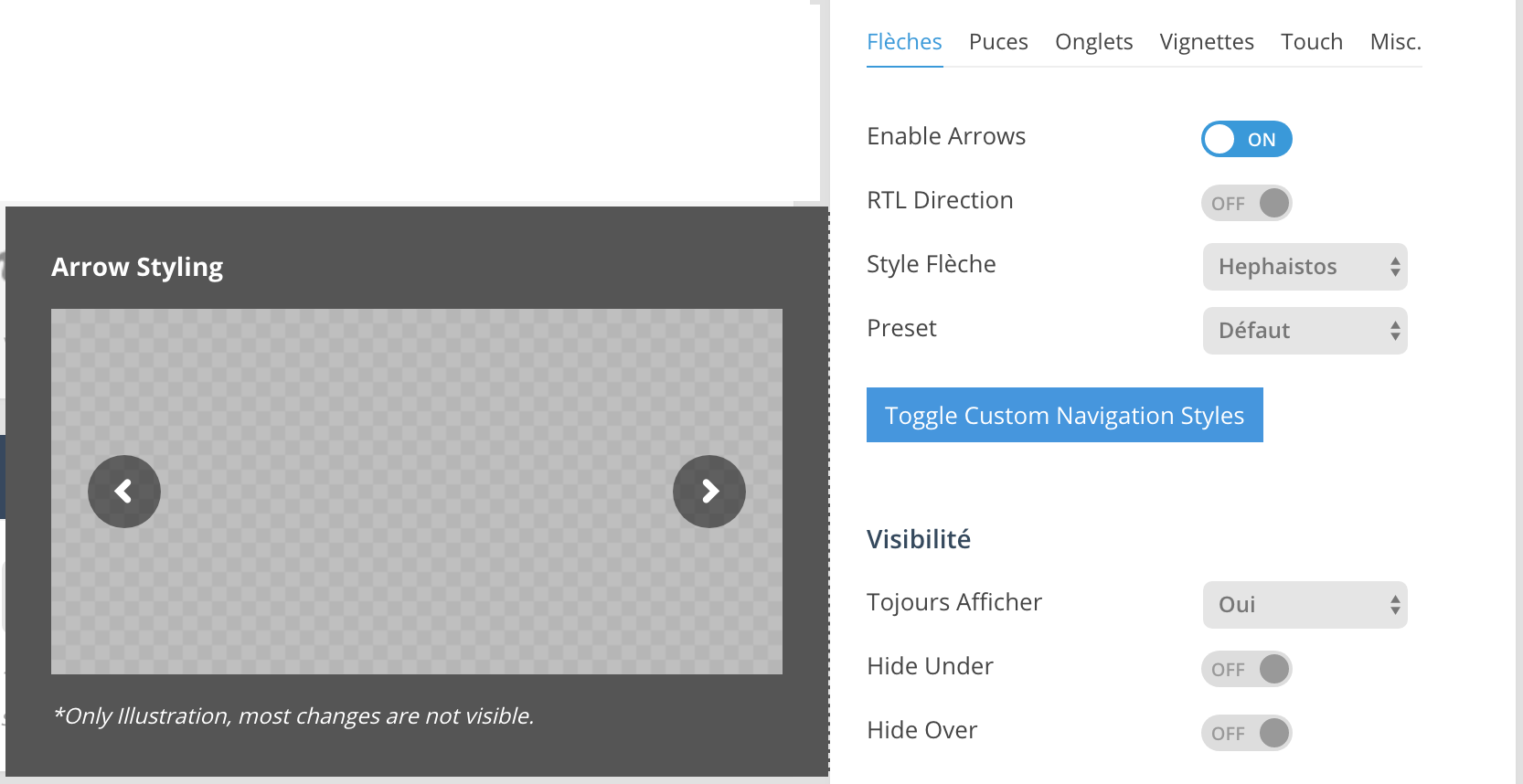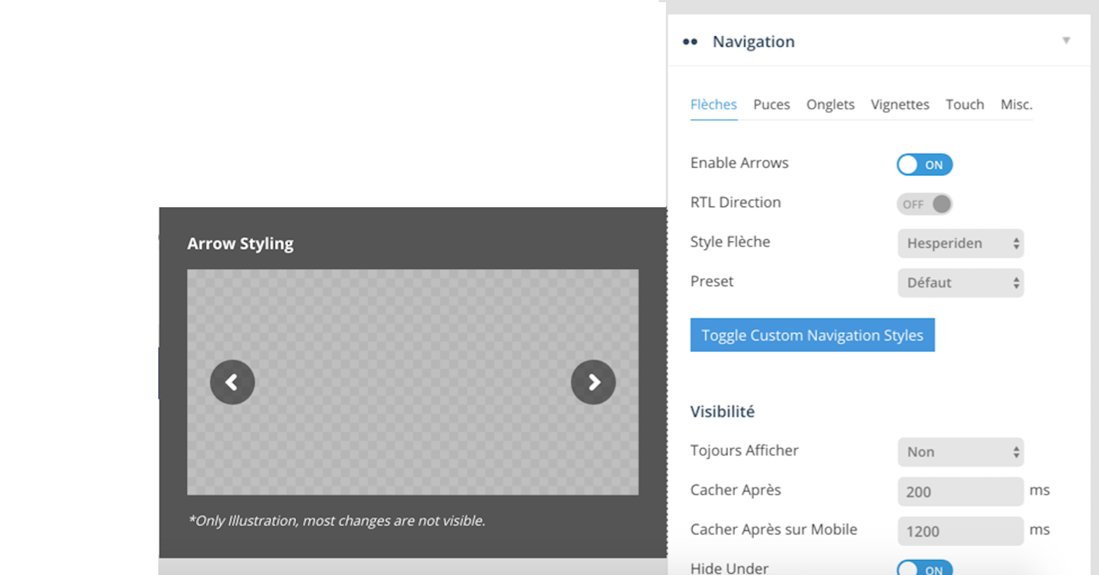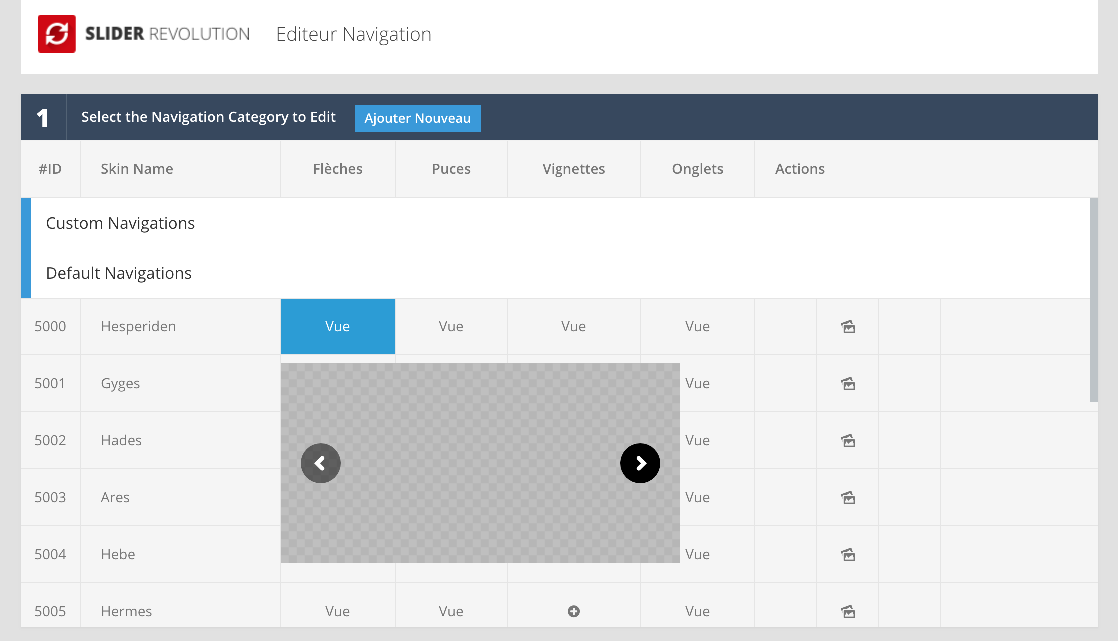 Editeur Navigation : référence tous les éditeurs disponibles pour configurer sa navigation. A savoir les flèches de droite et de gauche et les puces.