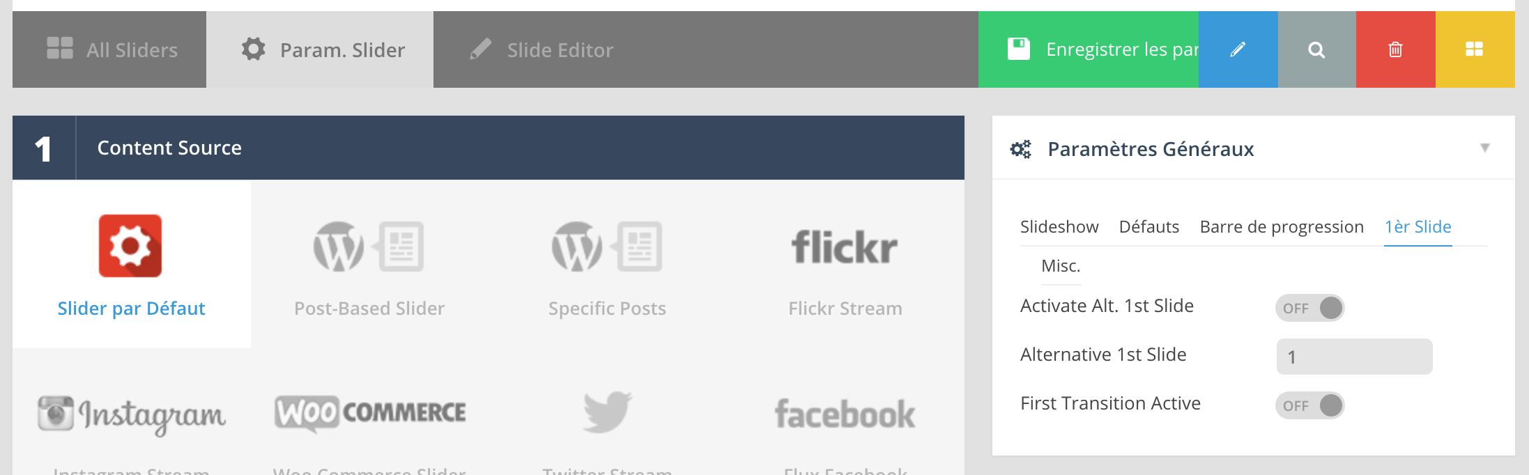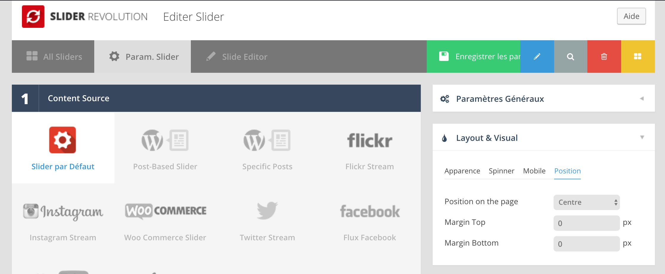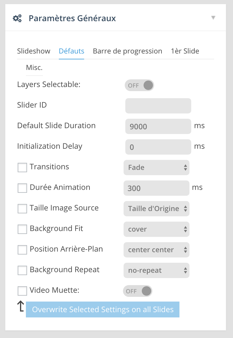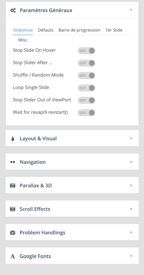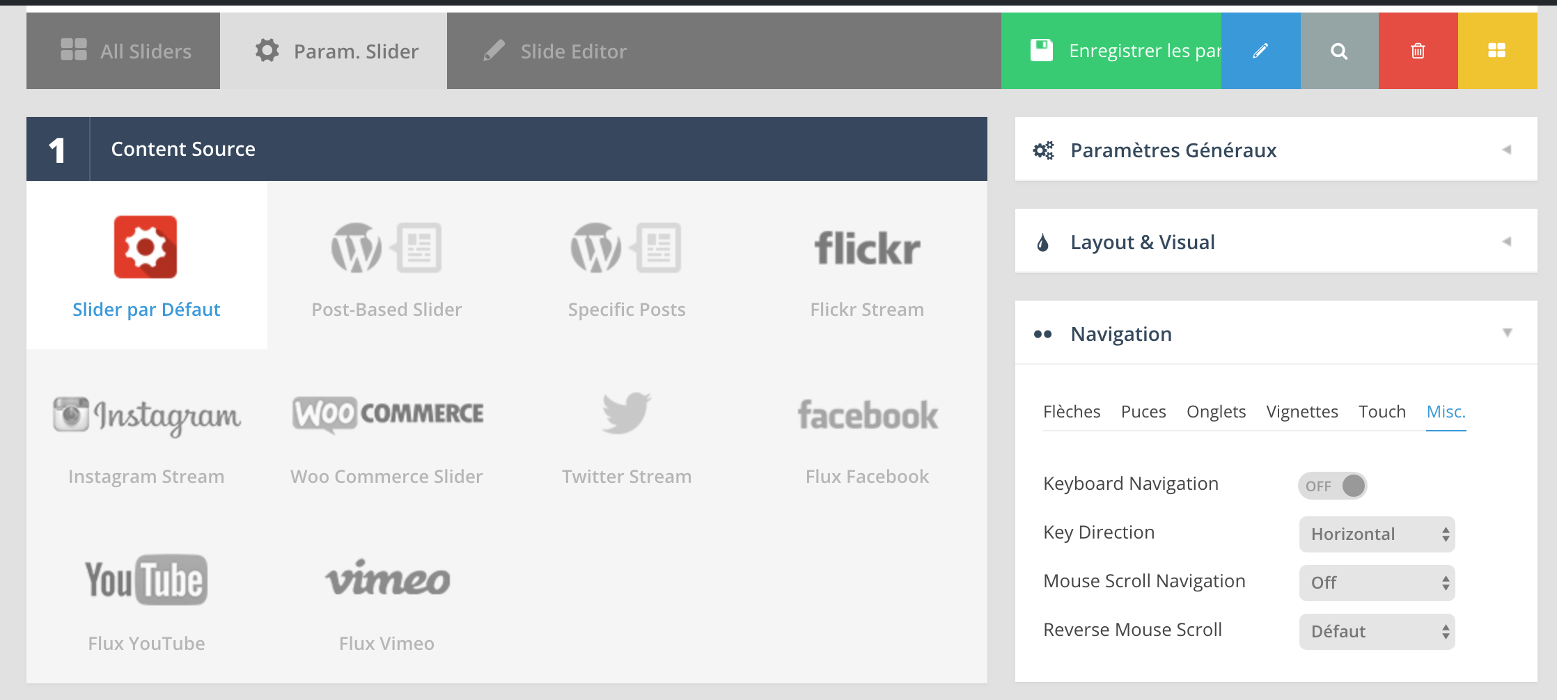 Paramètres généraux : permet de gérer la configuration générale des sliders comme la largeur et hauteur par défaut, les dimensions pour les différents supports (desktop, tablettes, smartphones)...