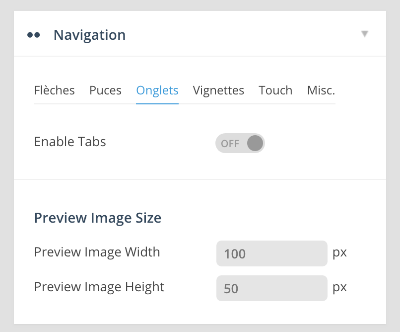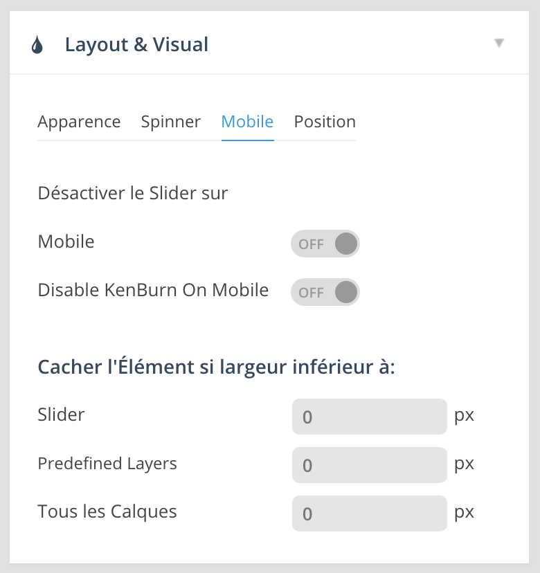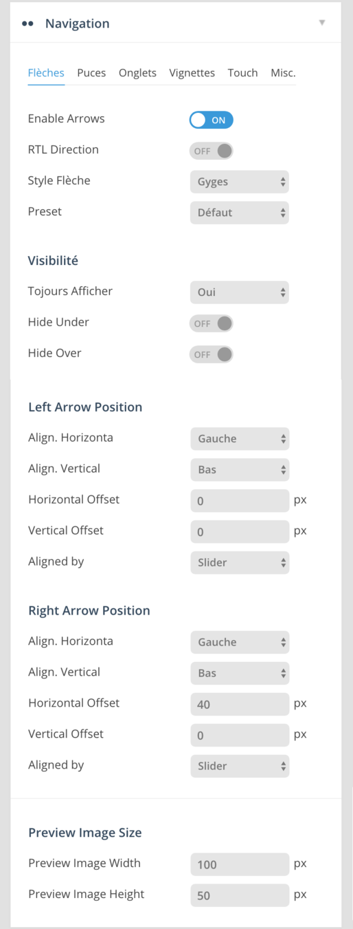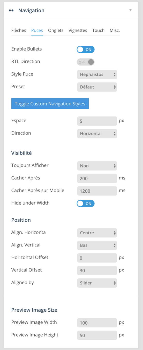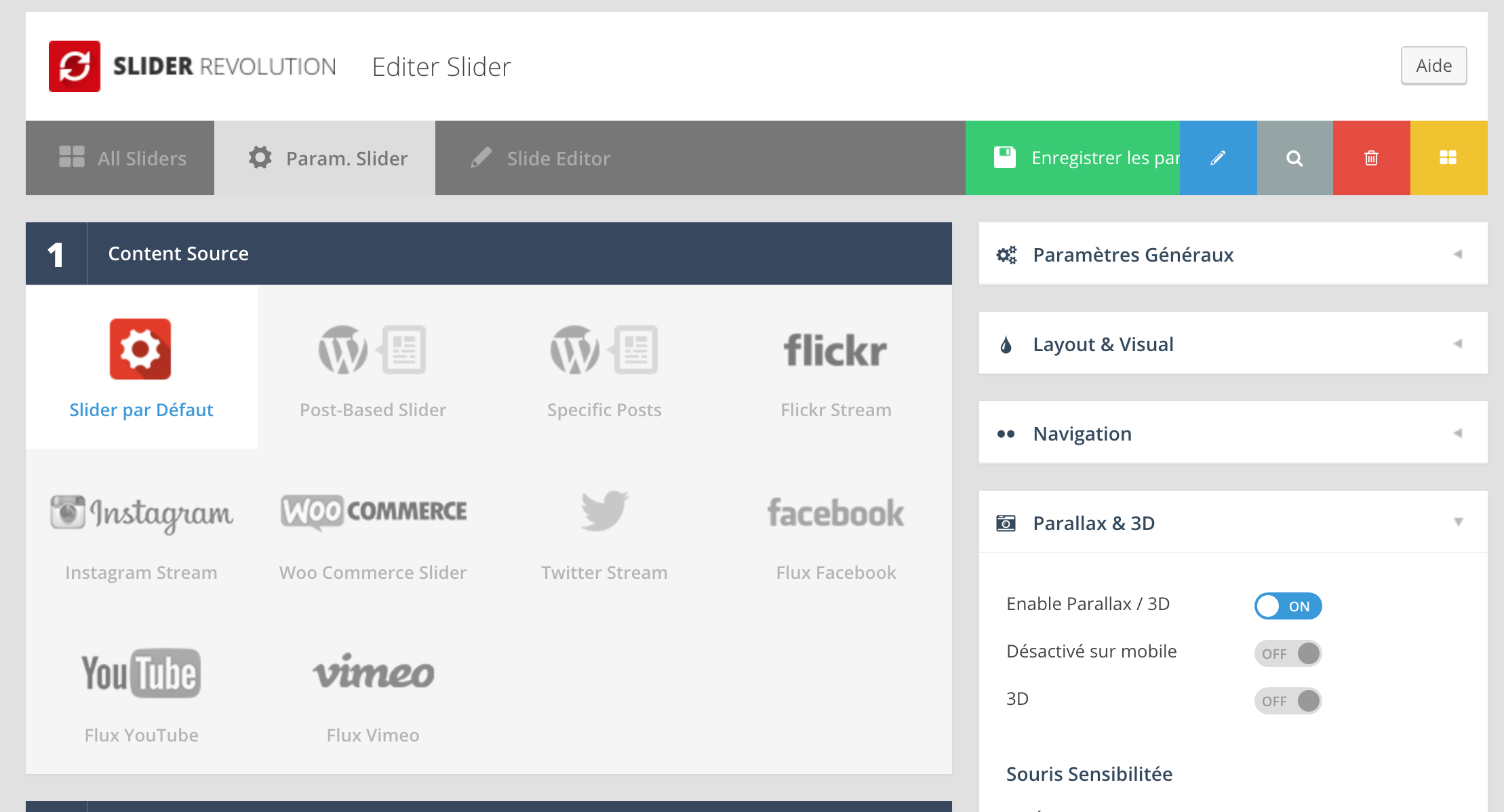 Paramètres généraux : permet de gérer la configuration générale des sliders comme la largeur et hauteur par défaut, les dimensions pour les différents supports (desktop, tablettes, smartphones)...