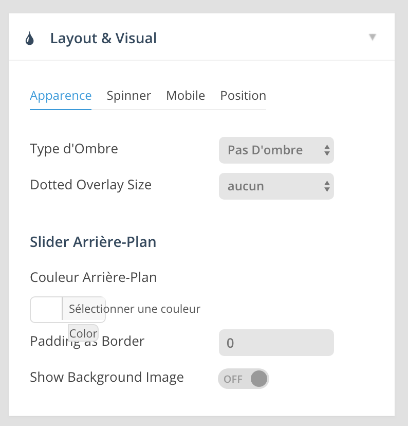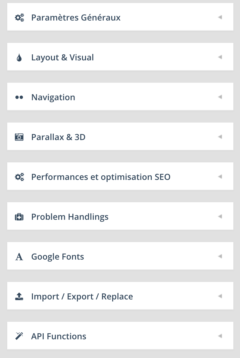 Pour configurer vos blocs Paramétres Généraux, Layout & Visual, Navigation, Parallax & 3D...