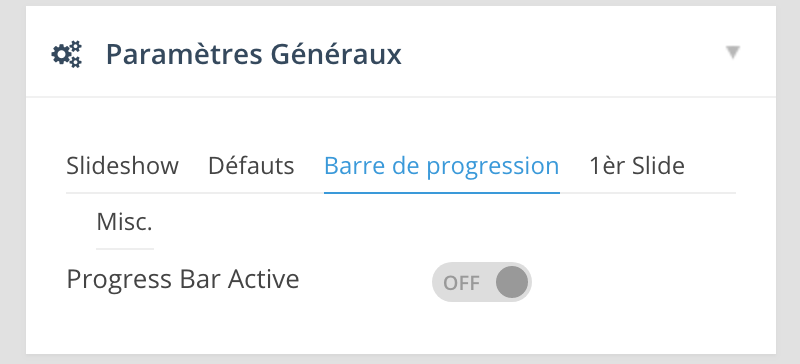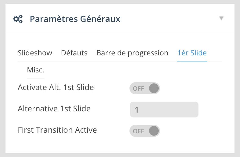 Défauts : permet de configurer la sélection de slides qui seront affichées et la configuration des transitions par défaut.