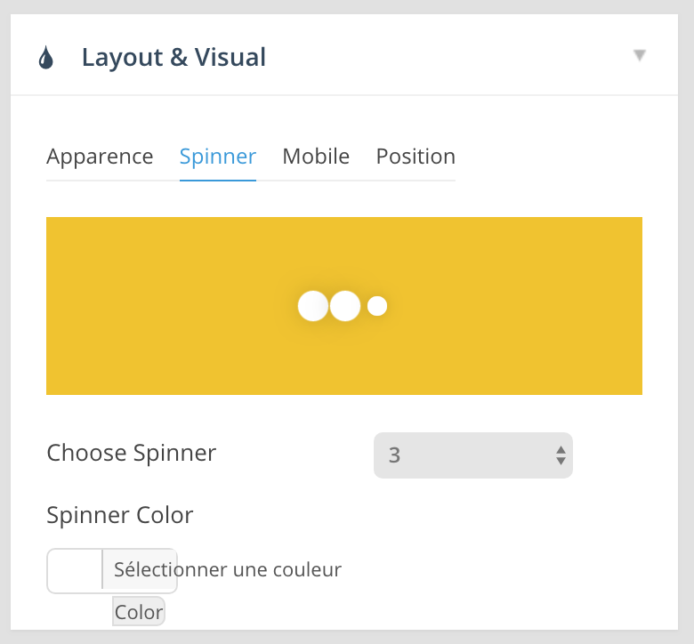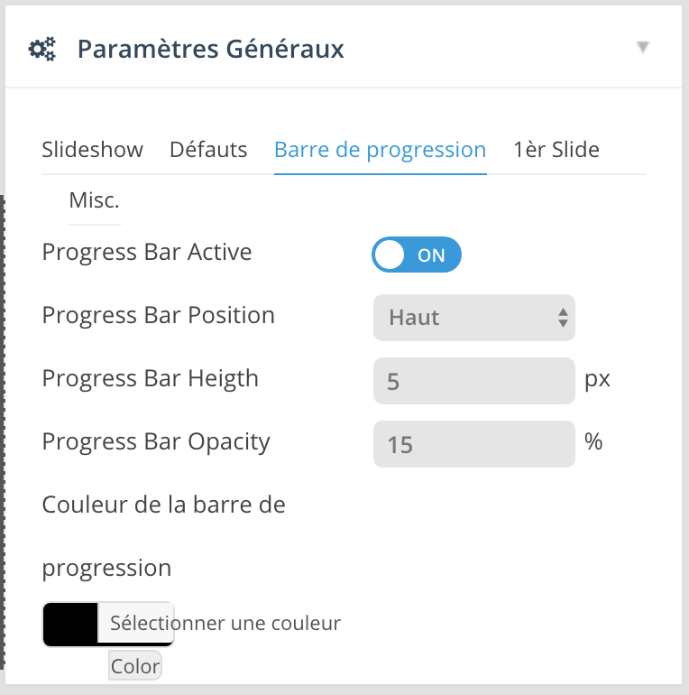 Barre de progression : permet de rendre active ou non la barre de progression. Si activée en mode ON, des actions de personnalisations sont proposées :