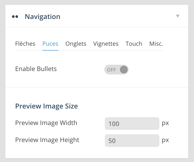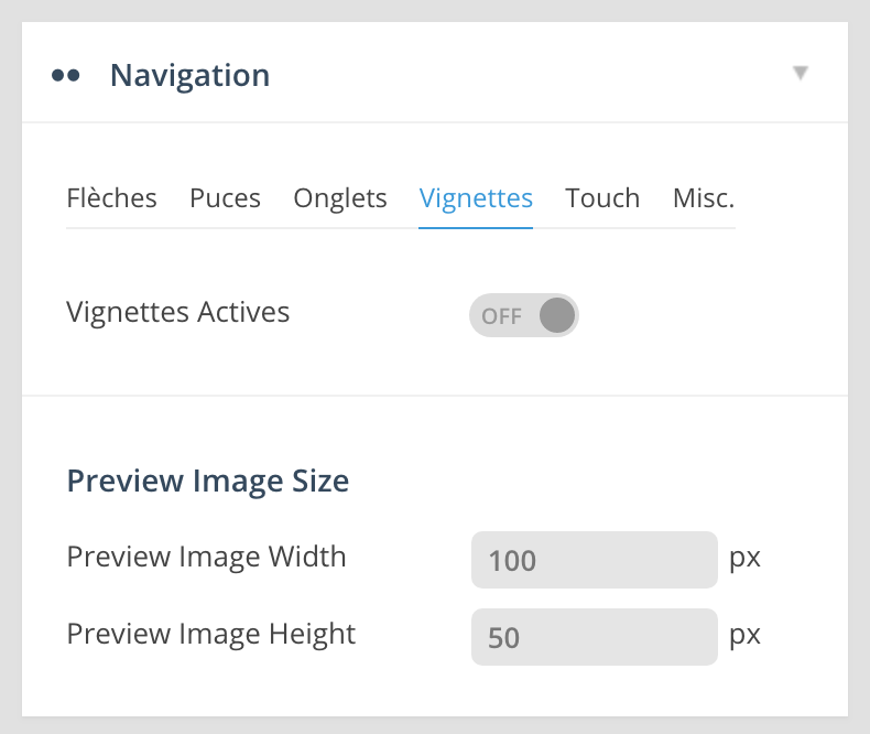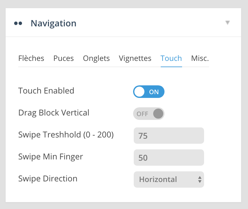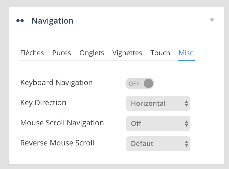 - Mouse Scroll Navigation en mode ON pour sensibiliser le scroll de votre souris à la navigation de votre slider si votre curseur se trouve dans l'élément.