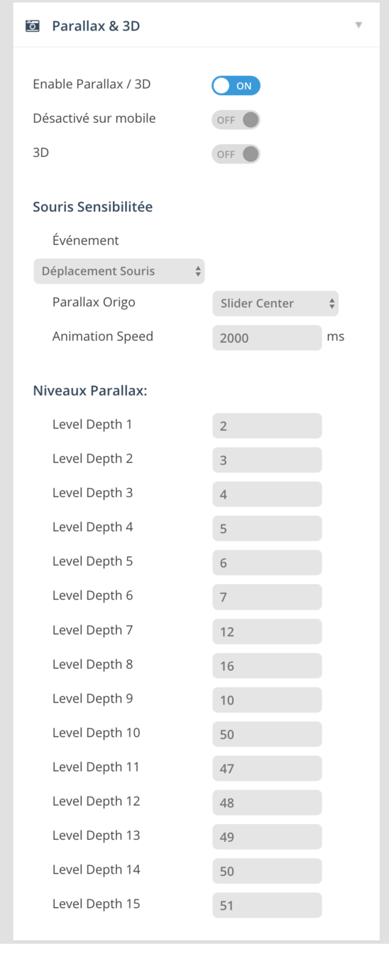 Enable Parallax & 3D : permet d'activer et configurer l'effet parallax et/ou 3D sur les supports desktop, portable et mobile.
