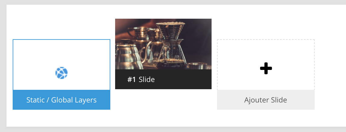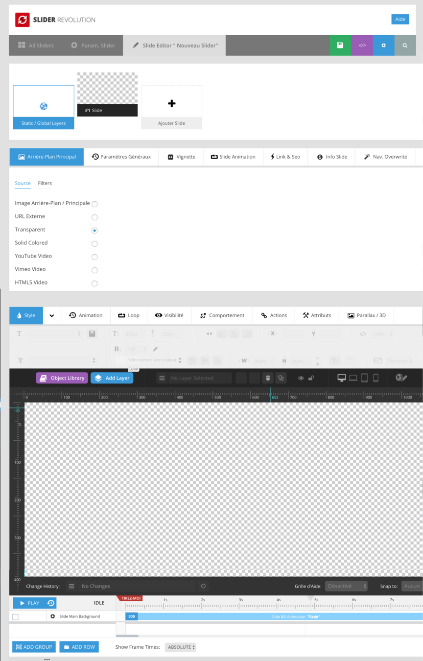 Zone de configuration de la slide individuelle : permet d'ajouter un fond d'écran de plusieurs manières, d'attribuer des paramètres généraux pour cette slide individuelle ou encore d'y ajouter les vignettes, intégrer une animation....
