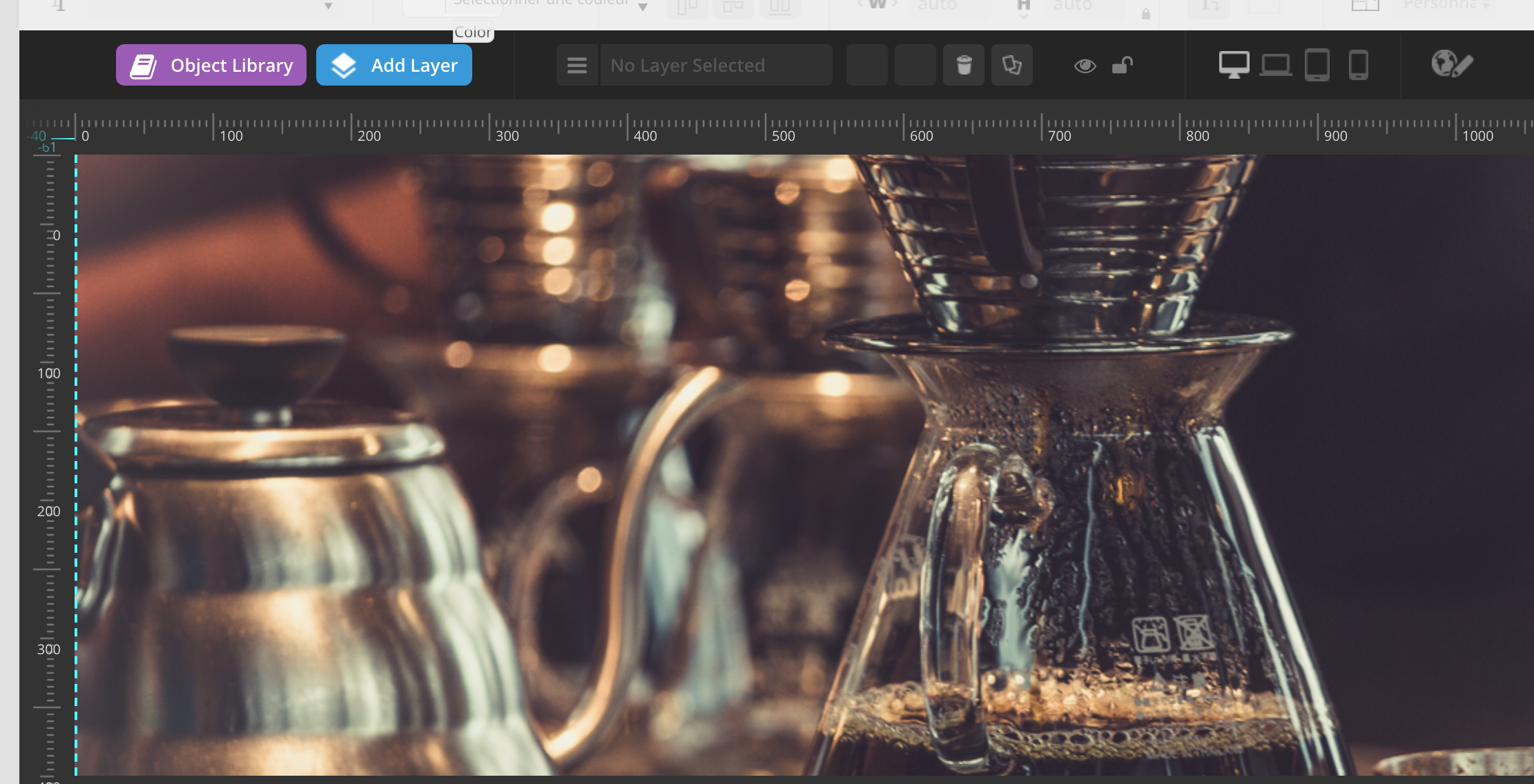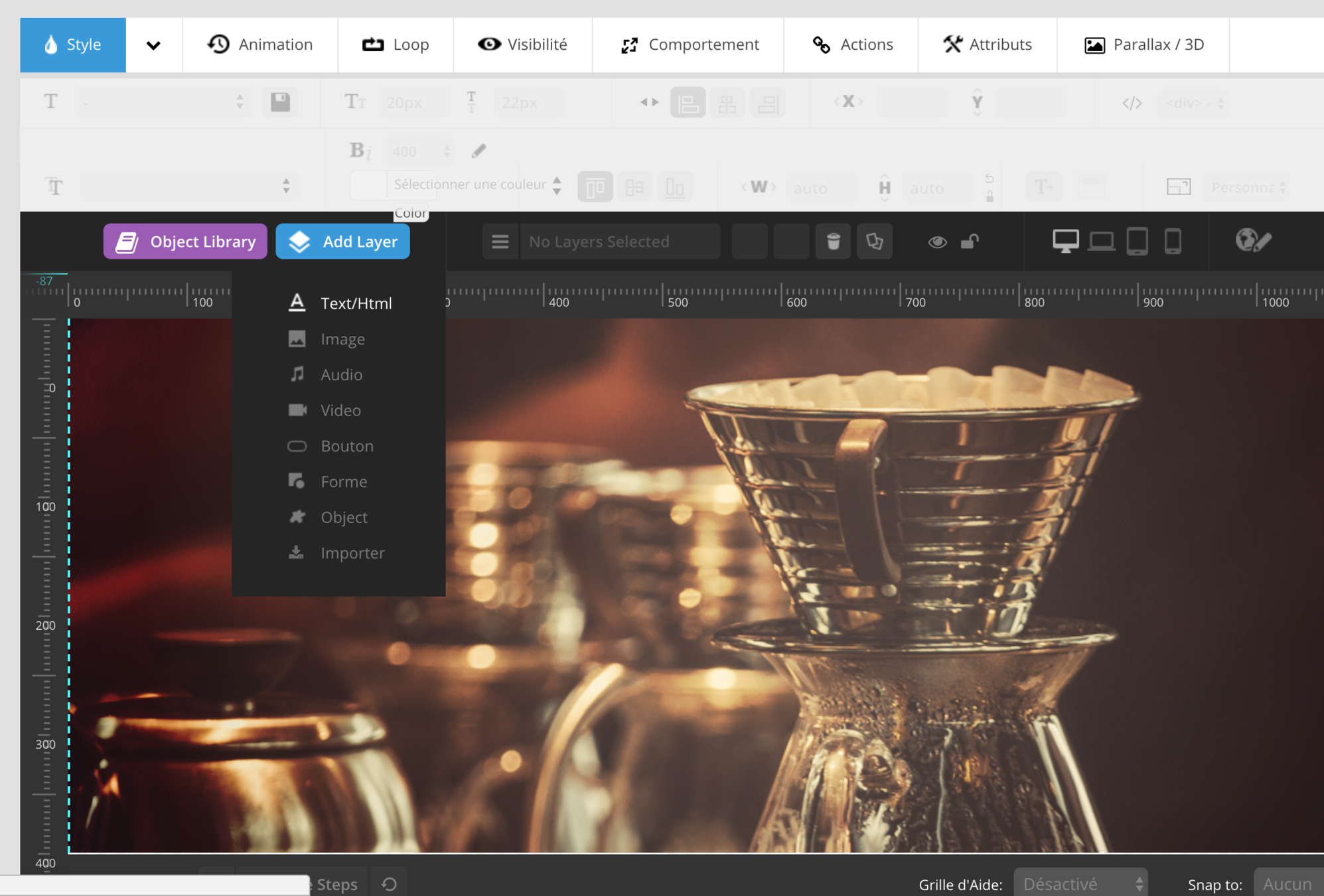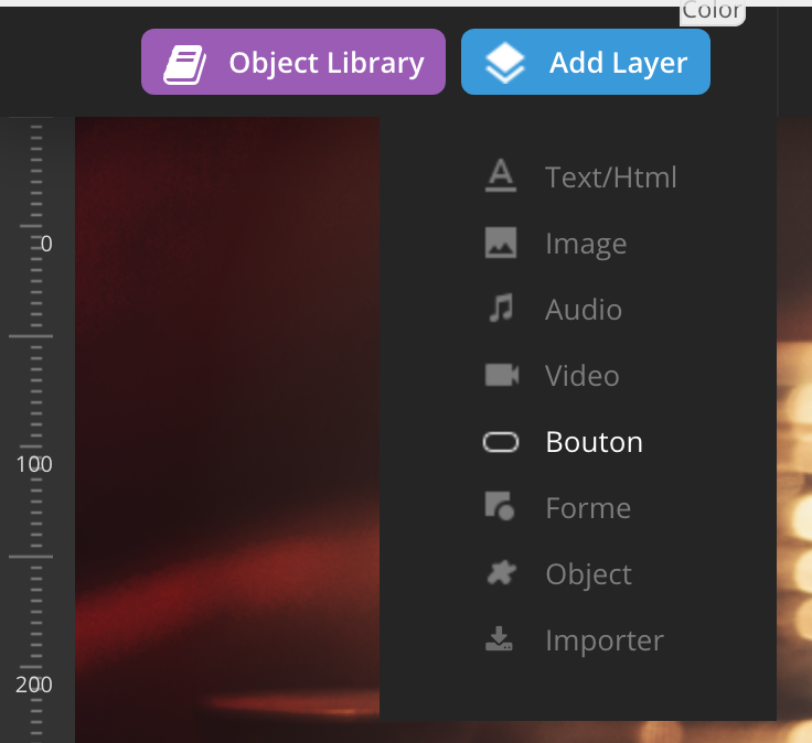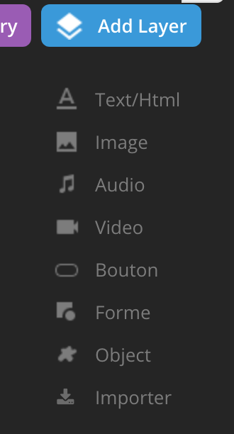Nous allons travailler dans l'éditeur de Slides. Pressez le bouton bleu pour ajouter des couches de contenu comme du Texte, Image, Audio, Video, Boutom, Forme, Objet ou importer ses propres contenus.