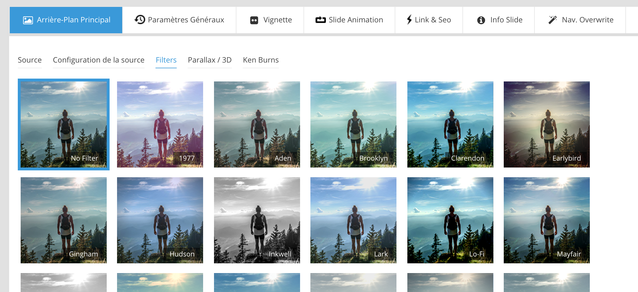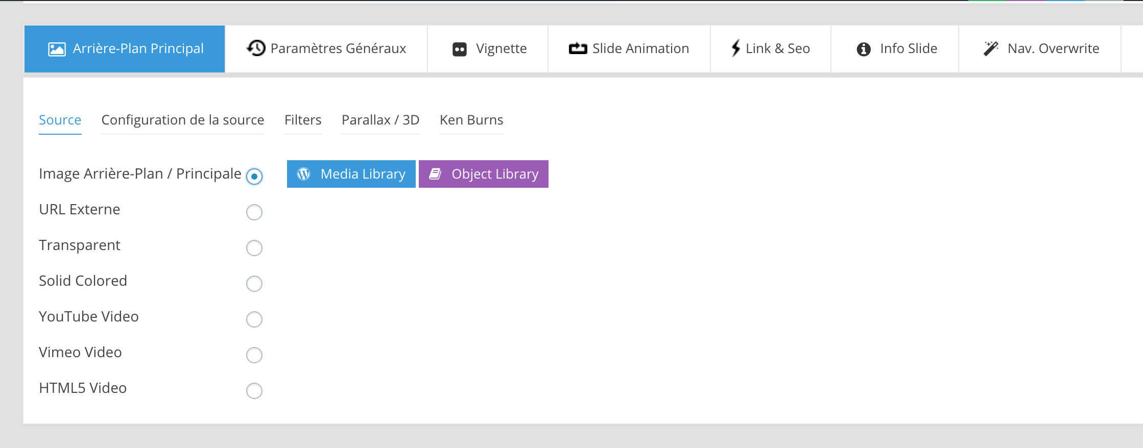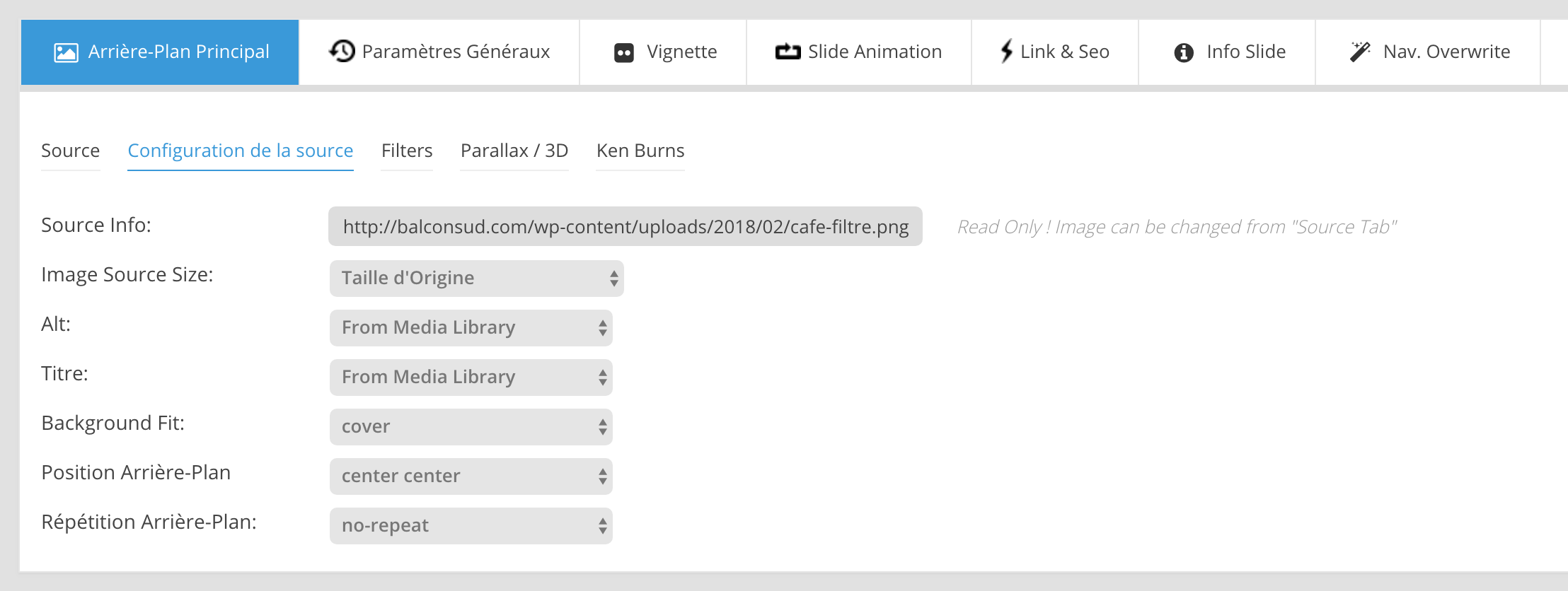 Note : En pressant cette option, des sous-onglets sont apparus : Source, Configuration de la source, Filters, Parallax/3D, Ken Burns