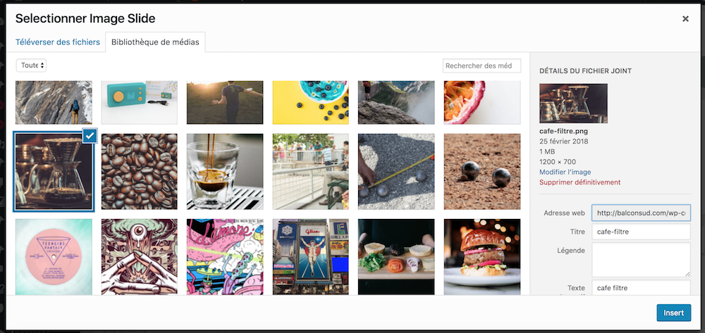 Cochez la première case intitulée "Image Arrière-Plan / Principale". Puis pressez le bouton bleu "Media Library" pour télécharger une image ou en sélectionner une déjà stockée dans votre Bibliothèque de Médias. Validez votre choix d'image d'Arrière Plan en pressant le bouton "Insert".