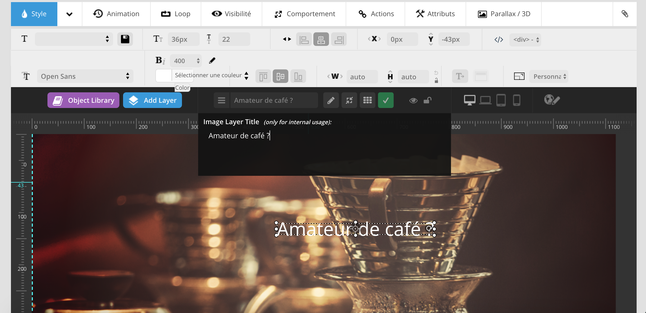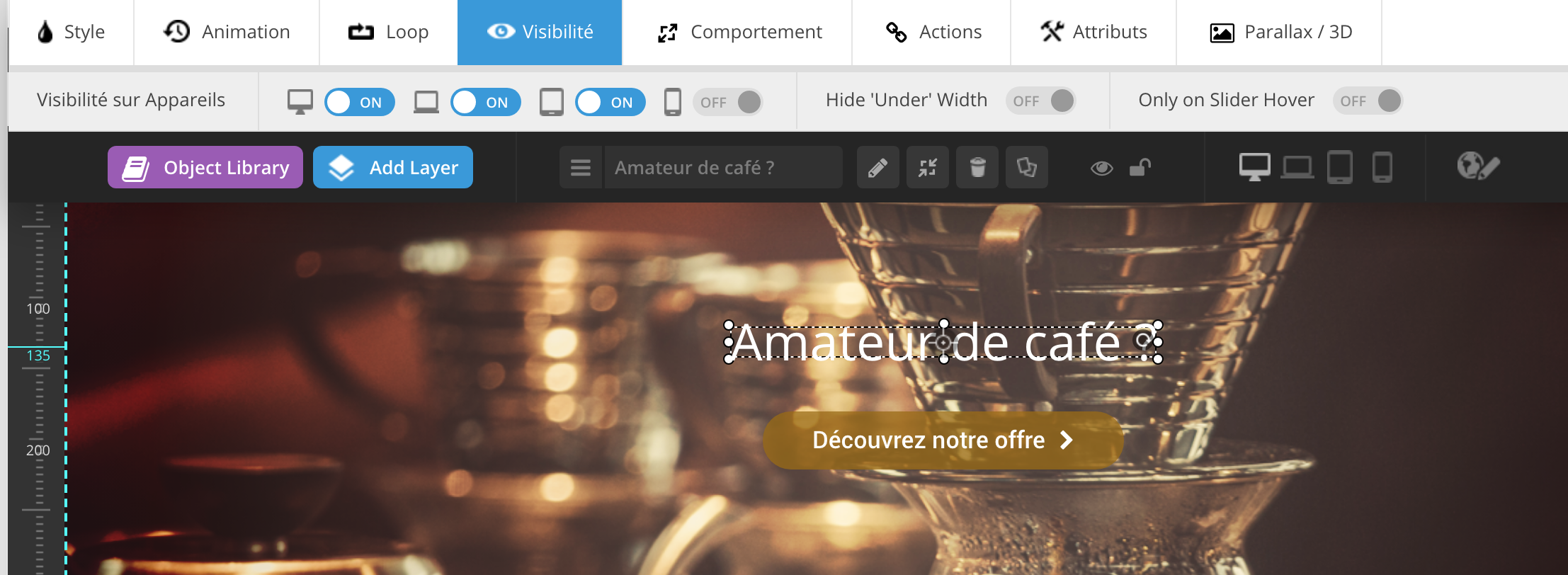 Dans Visibilité, Sélectionnez le texte créé et désactivez-le visibilité sur Desktop, Portable et Tablette