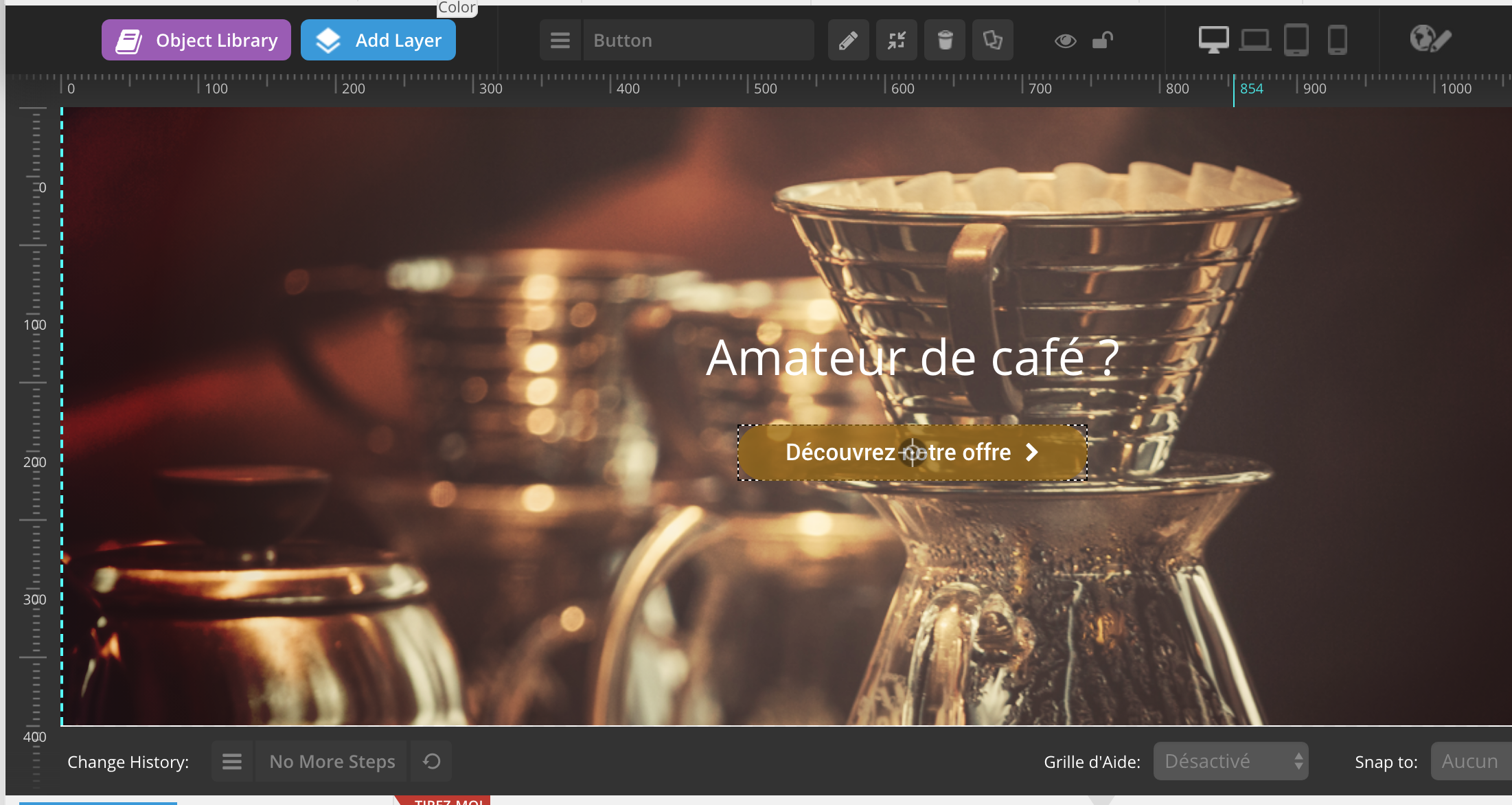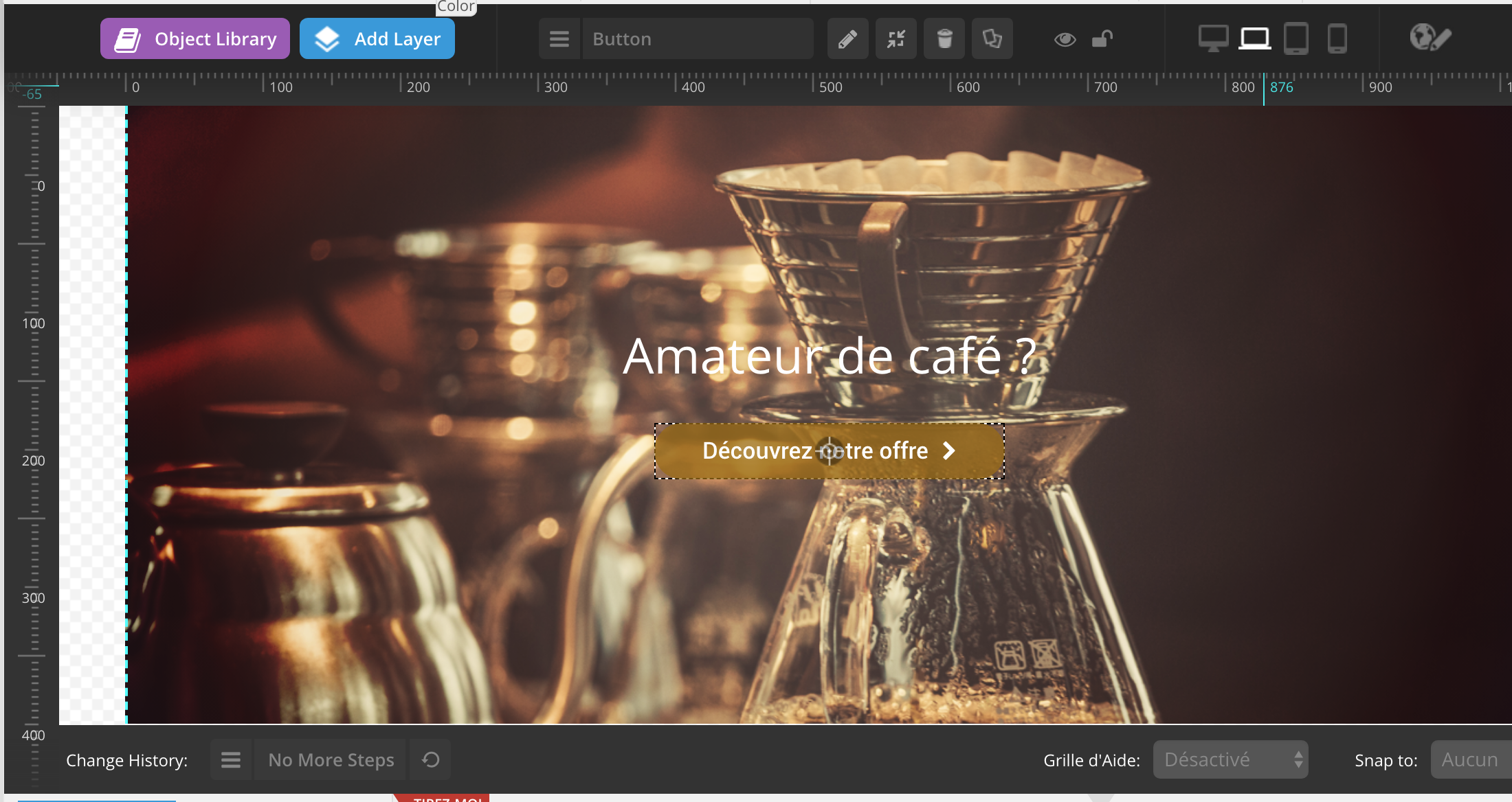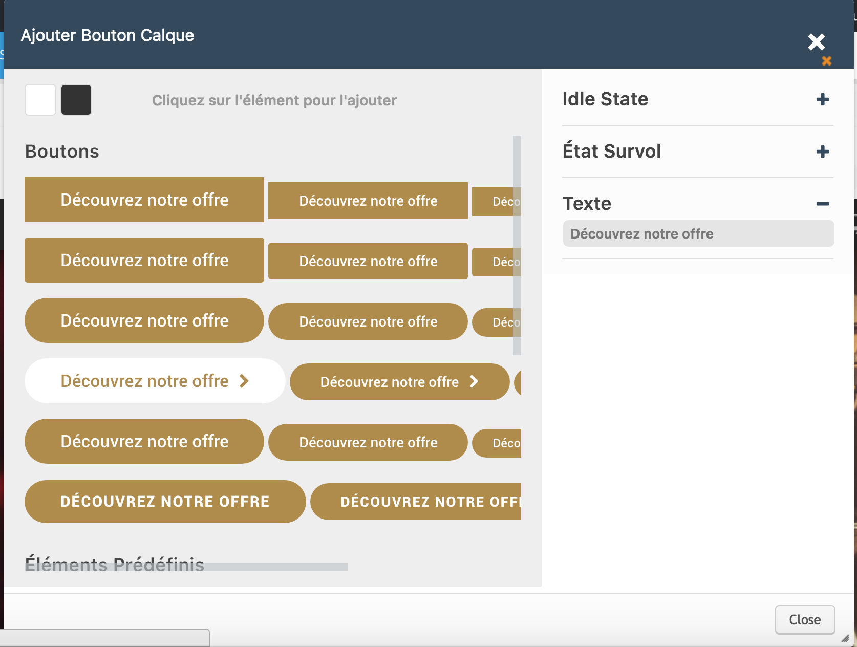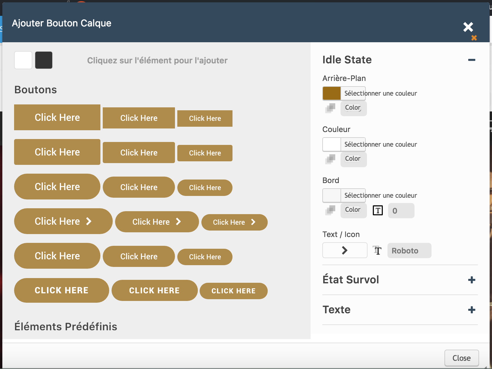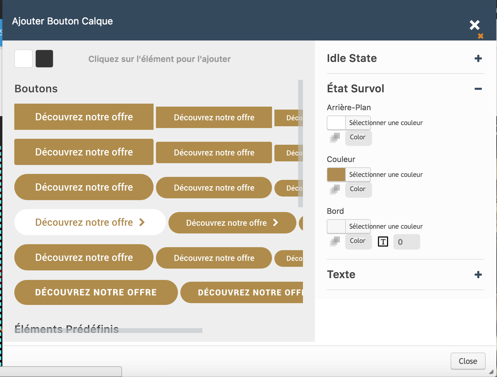 En cliquant "Bouton" vous allez ajouter votre bouton mais avant vous aller le styler le comme vous le souhaitez avec les couleurs d'Arrière plan, du texte, bordure et icône que vous déterminerez pour l'Idle State (= Etat de Repos) ou Etat initial , l'Etat de survol ainsi que l'ajout du Texte personnalisé