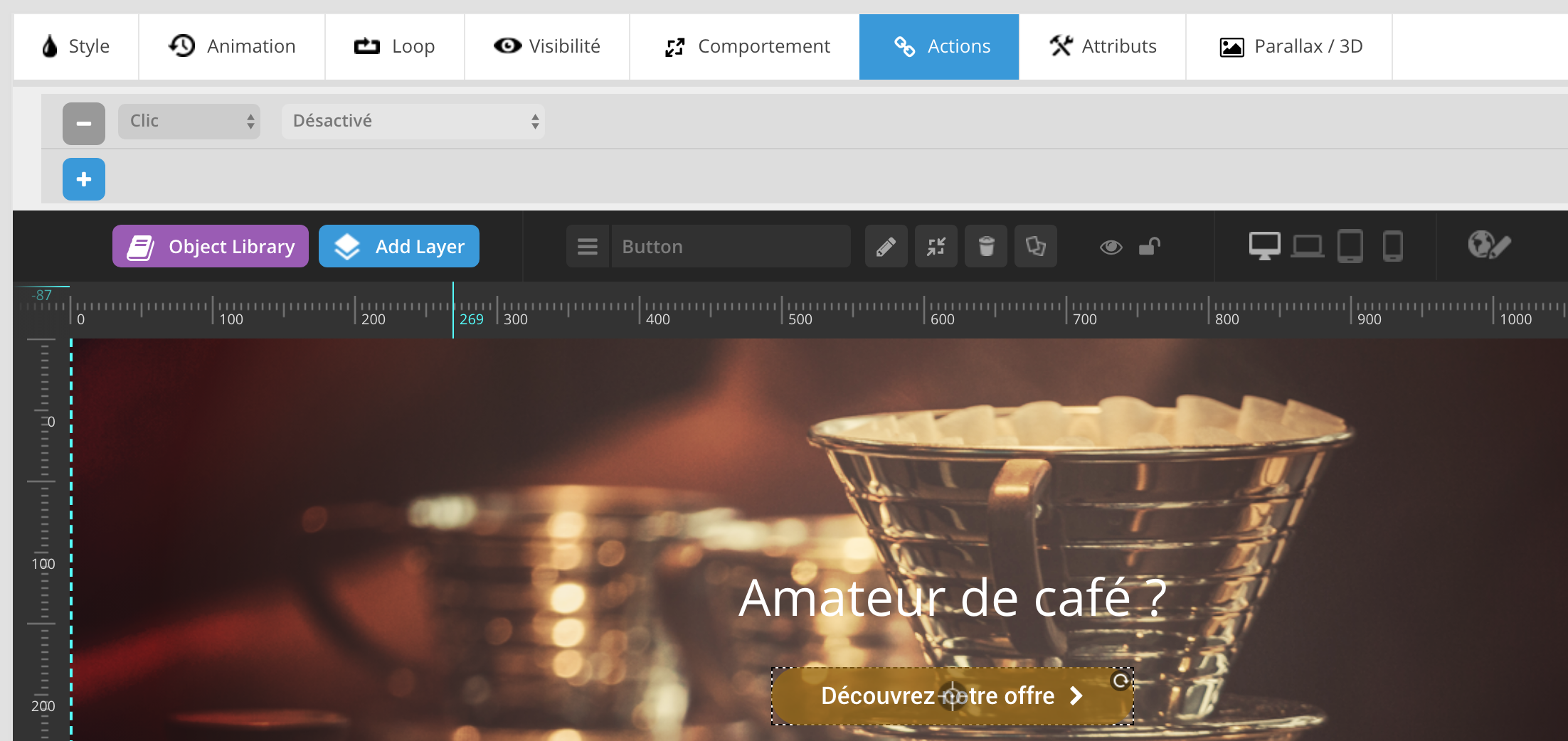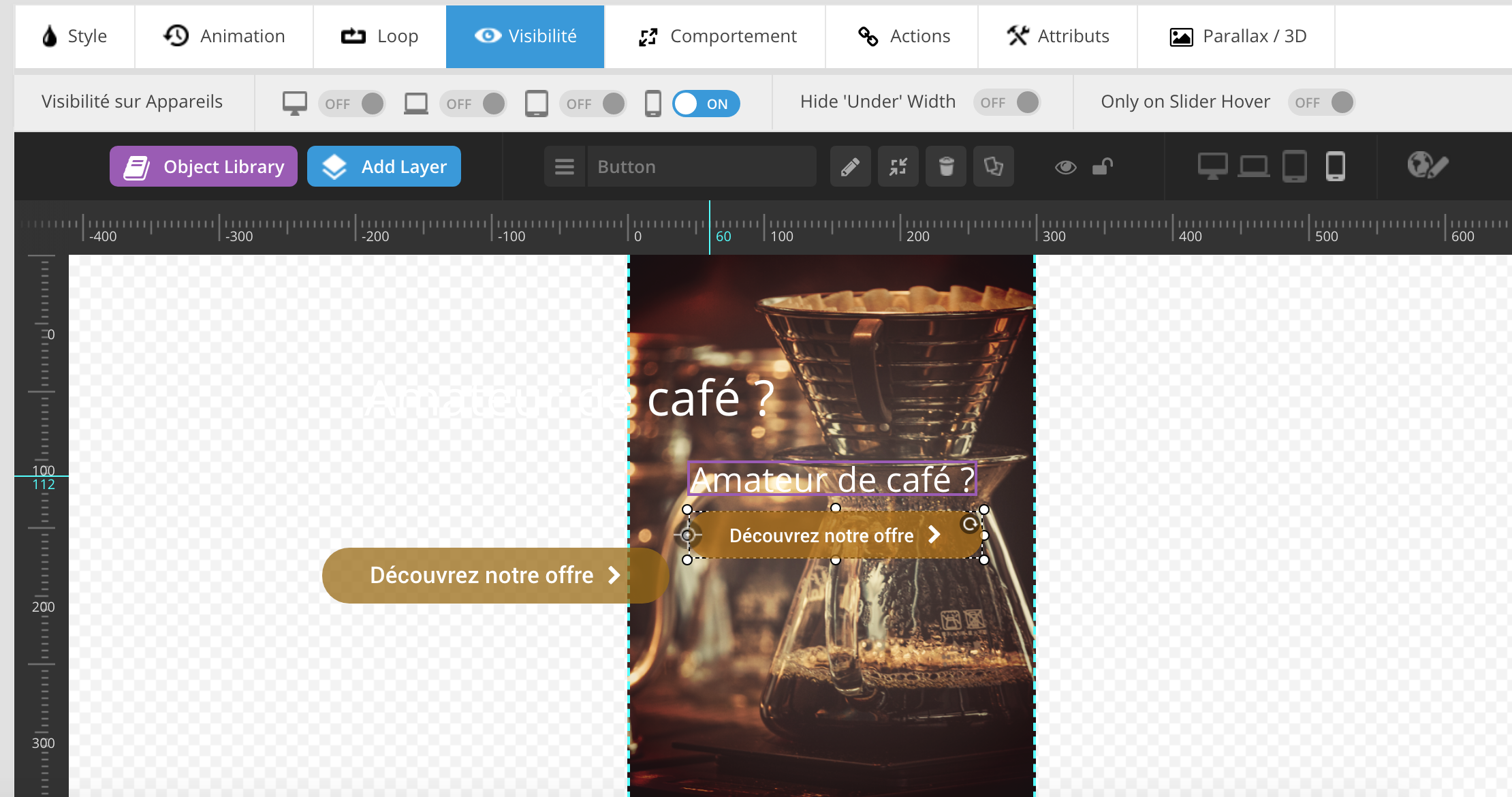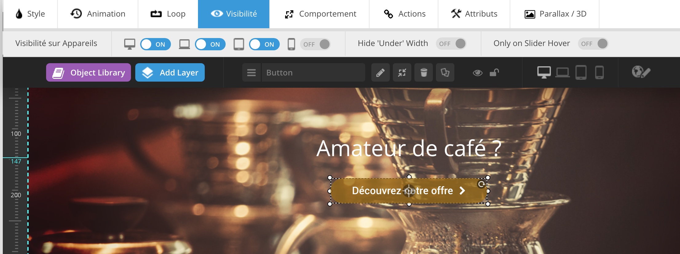 Dans Visibilité, Sélectionnez le bouton créé et désactivez-le visibilité sur Desktop, Portable et Tablette