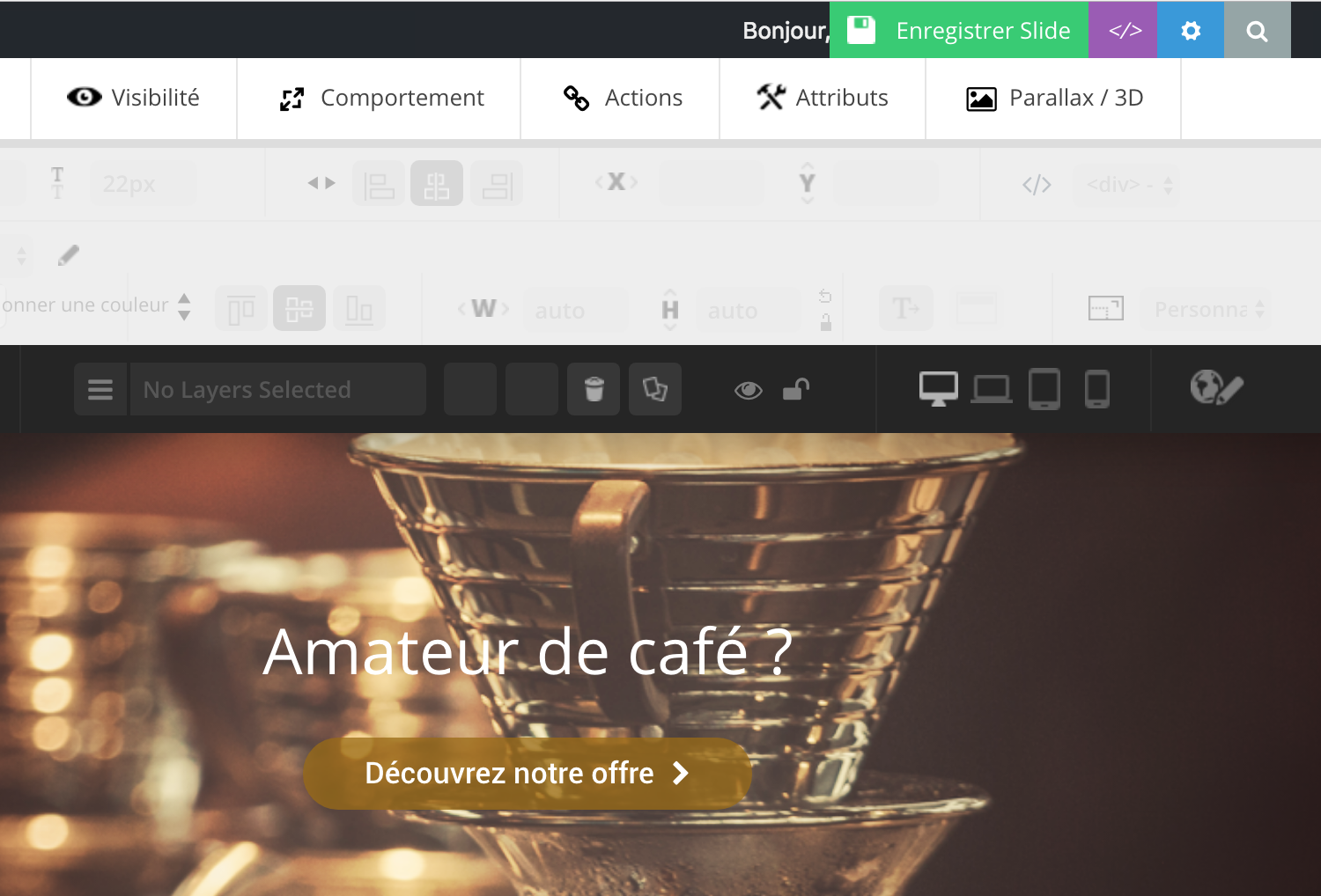 Slide Layers (= couche de slides) : Cette partie est l'éditeur de slide qui permet de mettre en forme le rendu, en y superposants des layers (= couches) de contenus : textes, images, boutons...