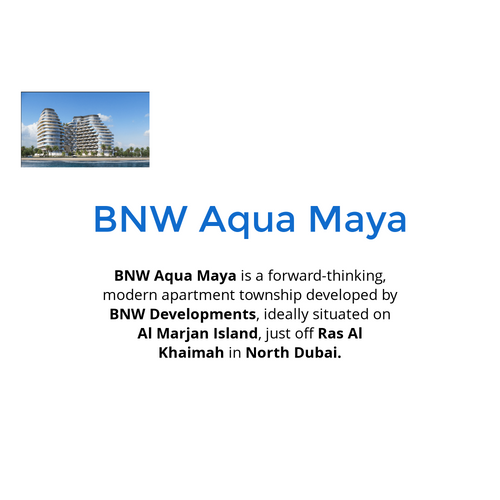 BNW Aqua Maya is a new age, futuristic Apartment Township project by BNW Developments, strategically located in Al Marjan Island, off Ras Al Khaimah, North Dubai.