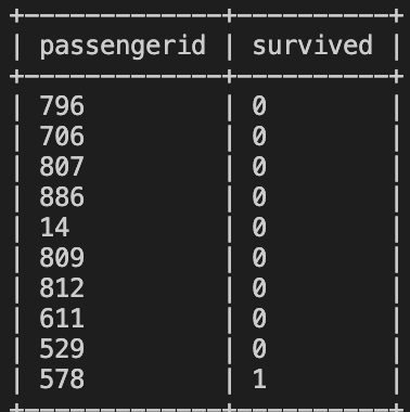 ProjectionExec: expr=[passengerid@0 as passengerid, survived@1 as survived]
