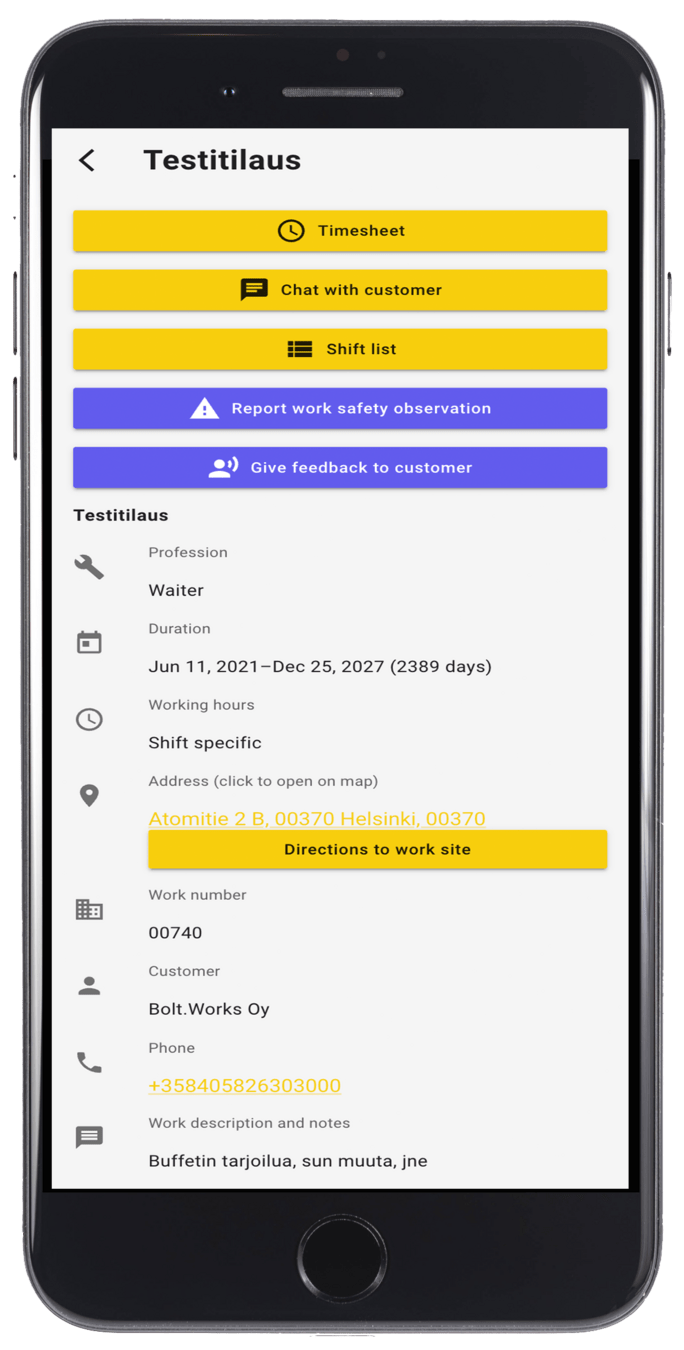 Bolt.Works puts all the information you need to do your job in one place. In the app, you can see the duration of the job, contacts and addresses, among other things. You can check the location of the job using the map in the app and navigate to the job site. You can also use the app to chat, which is the easiest way to communicate with your recruiter.